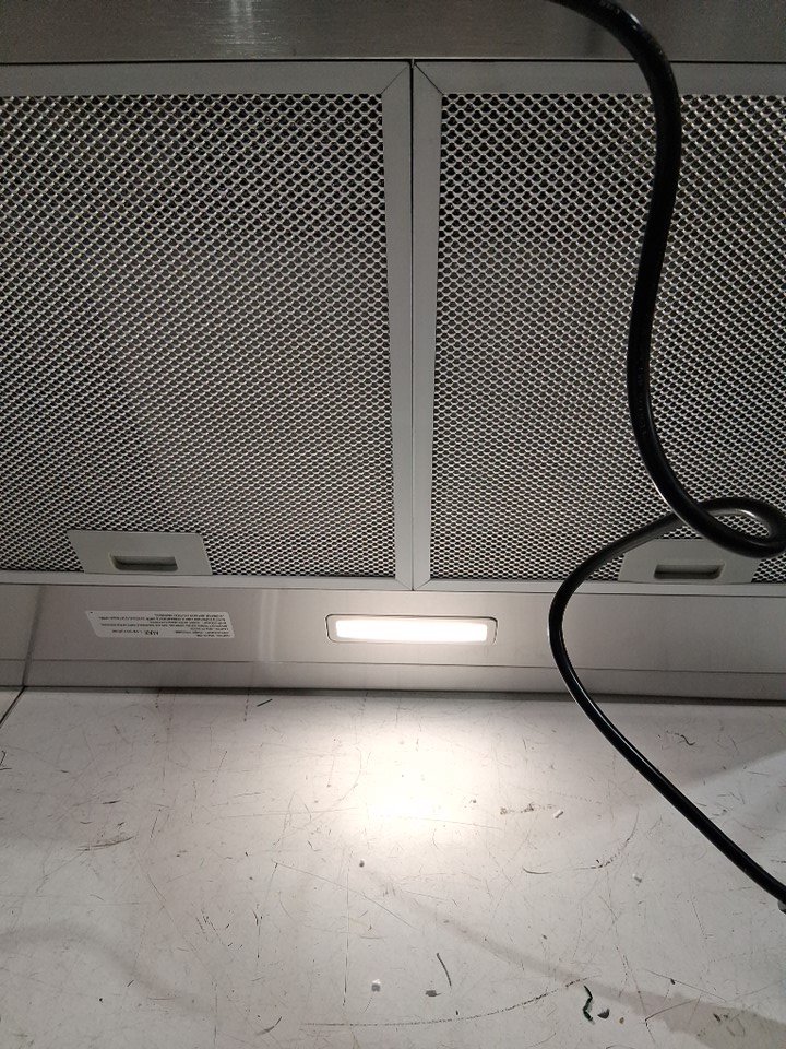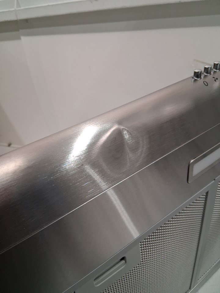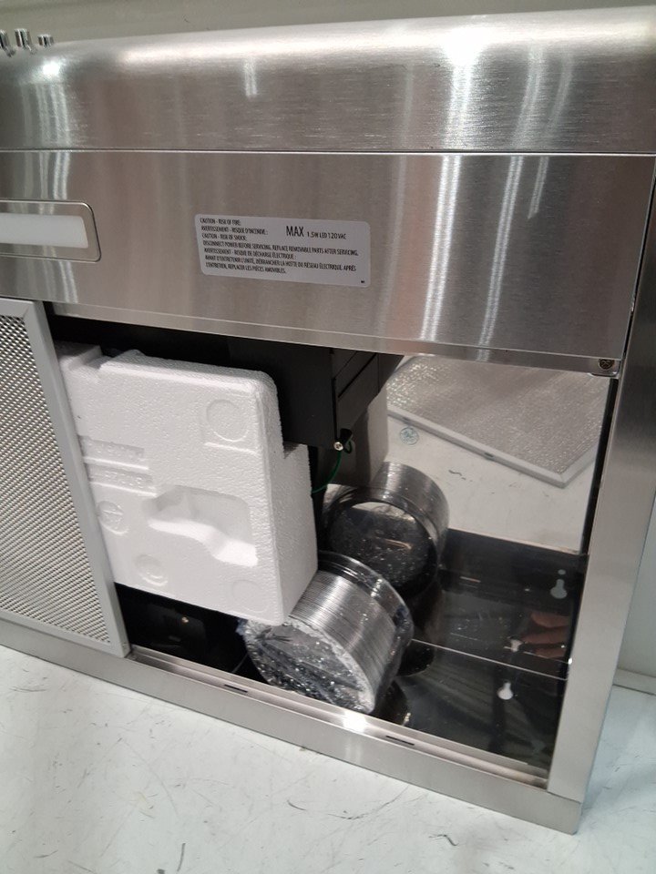 Dent on the range hood itself and the mesh grate included with the product also has some minor damage product was tested for power