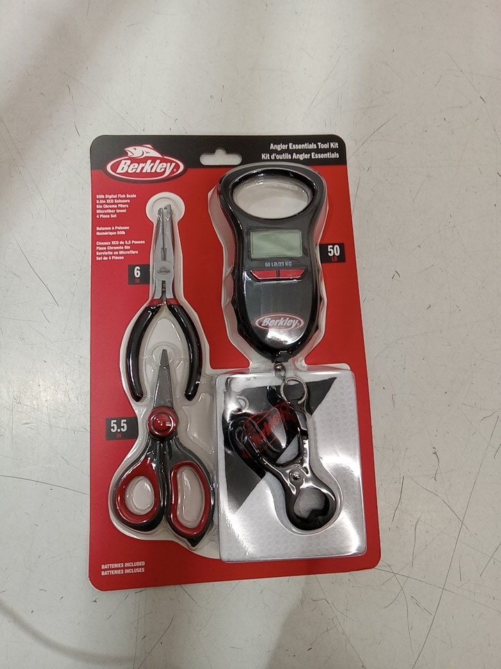 4PC Berkley angler essentials tool kit with scale, pliers, scissors and towel - 50lbs max - red/black