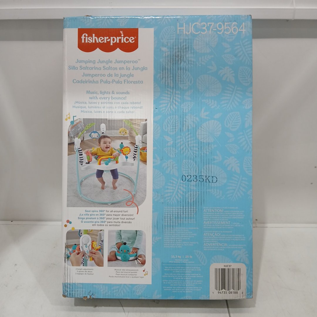 Fisher-Price Jumperoo Interactive Bouncer Baby Activity Center with Lights Sounds and Music - Jumping Jungle/Mint Blue/Green (model: HJC37-9564)