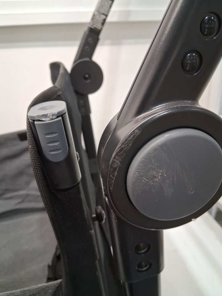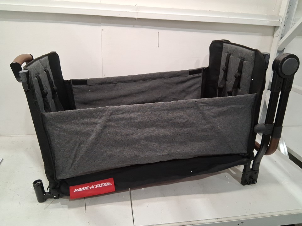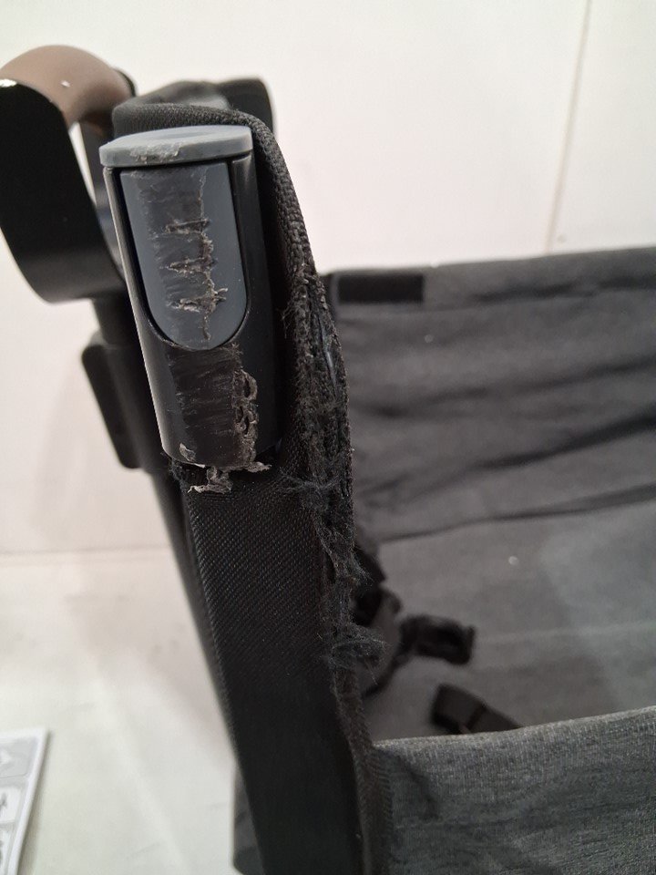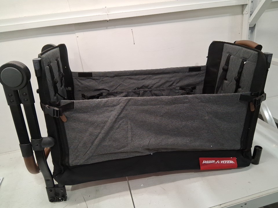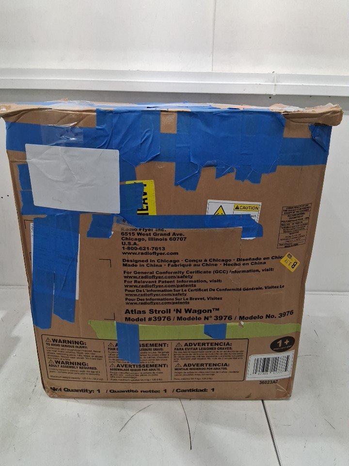 There are numerous scuffs and scratches on the plastic and metal parts of the wagon as well as on the handles, and a small rip in the fabric of the wagon as well as the corner of the larger storage box. 3 of the 4 rods used to hold up the overhead canopy appear to be missing, and there is also one screw that appears to be stuck in place where the back wheels attach to the wagon. Additionally, the wheels have some dirt stains/scratches on them and there is some dirt and grass on the inside of the wagon indicating that most of this damage likely occurred during prior ownership and use - please see photos. Outside of these issues and the missing canopy parts, there does not seem to be any major damage to any part that would impede the normal function or use of the wagon, though customer may need to supply some additional hardware (screws, etc) in case any has gone missing.