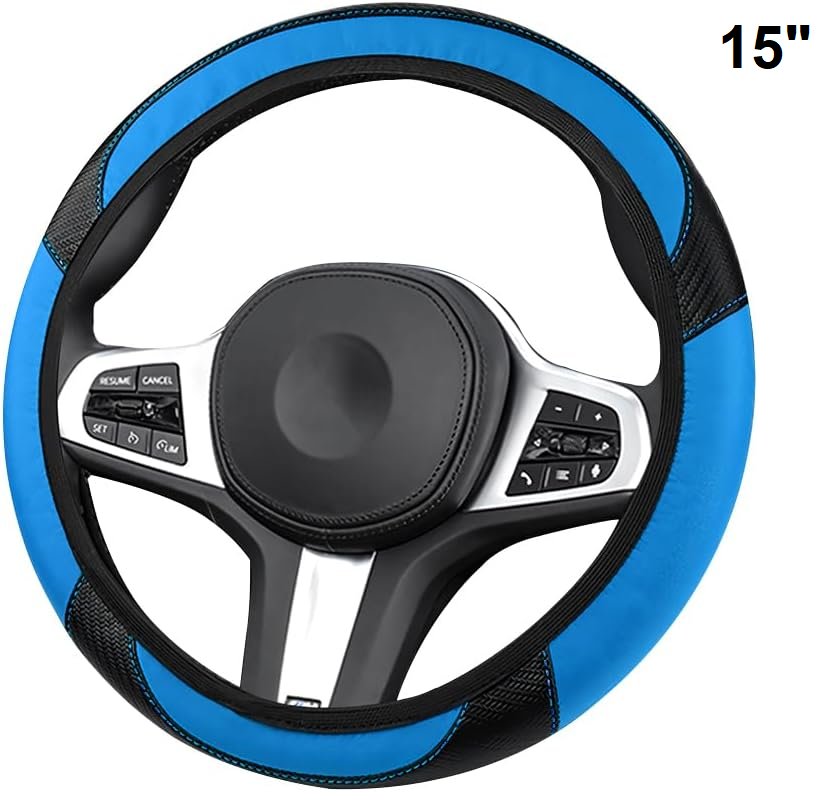 TSUGAMI Car Steering Wheel Cover, Anti-Slip PU Leather & Carbon Fiber Steering Wheel Protector - 15" - black / blue