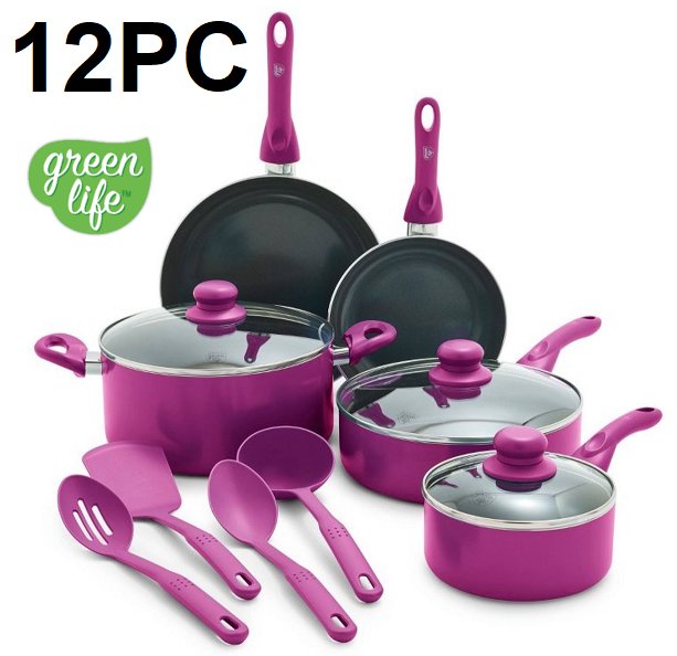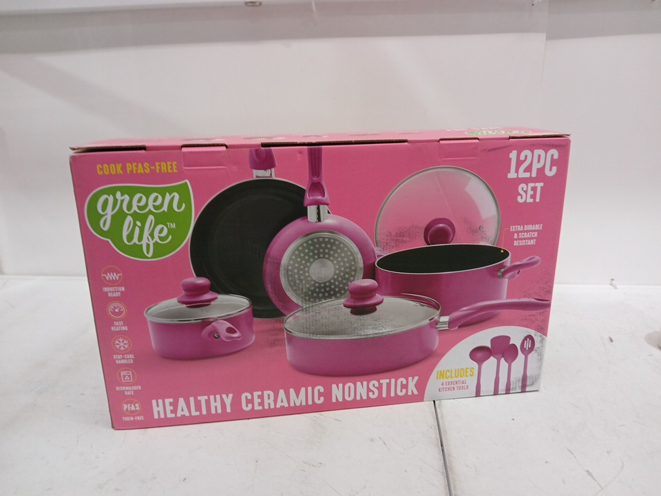 12PC GREENLIFE SOFT GRIP CERAMIC NON-STICK COOKWARE POTS AND PAN SET - BRIGHT PINK