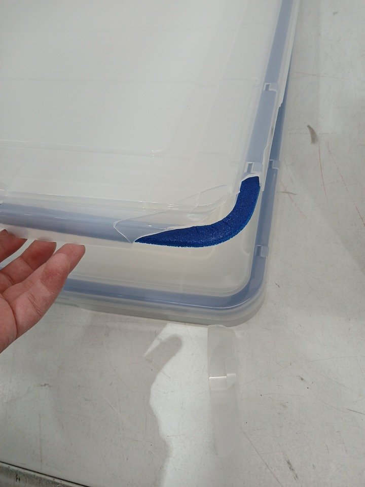 please note one lid is broken in the corner and one of the clamps on the bins is broken off, see photos