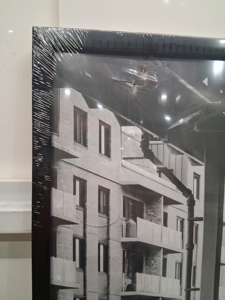 Only one of the plexiglass covers of the frame is damaged.