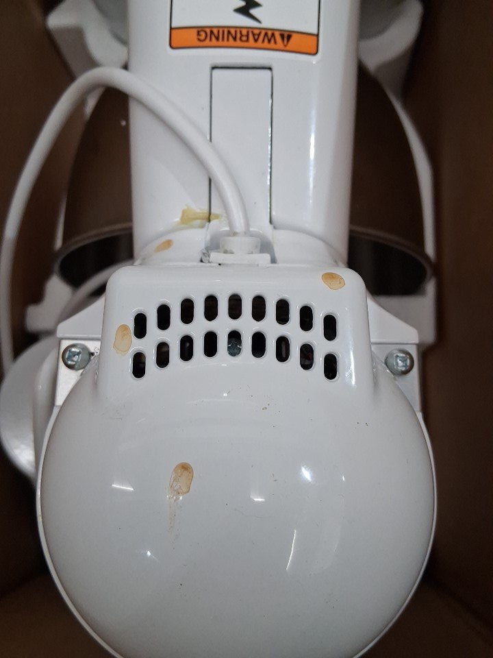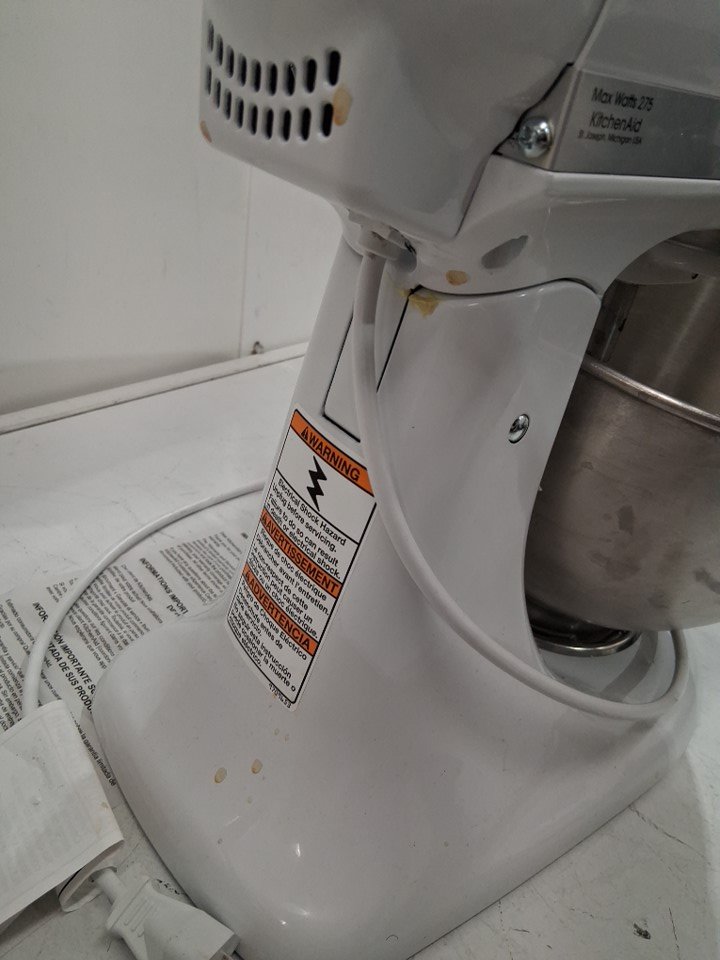 Product has heavy food residue throughout, and the dough hook is chipped (See photos) Is also missing 2 out of 3 attachments, the whisk and the paddle Tested for power