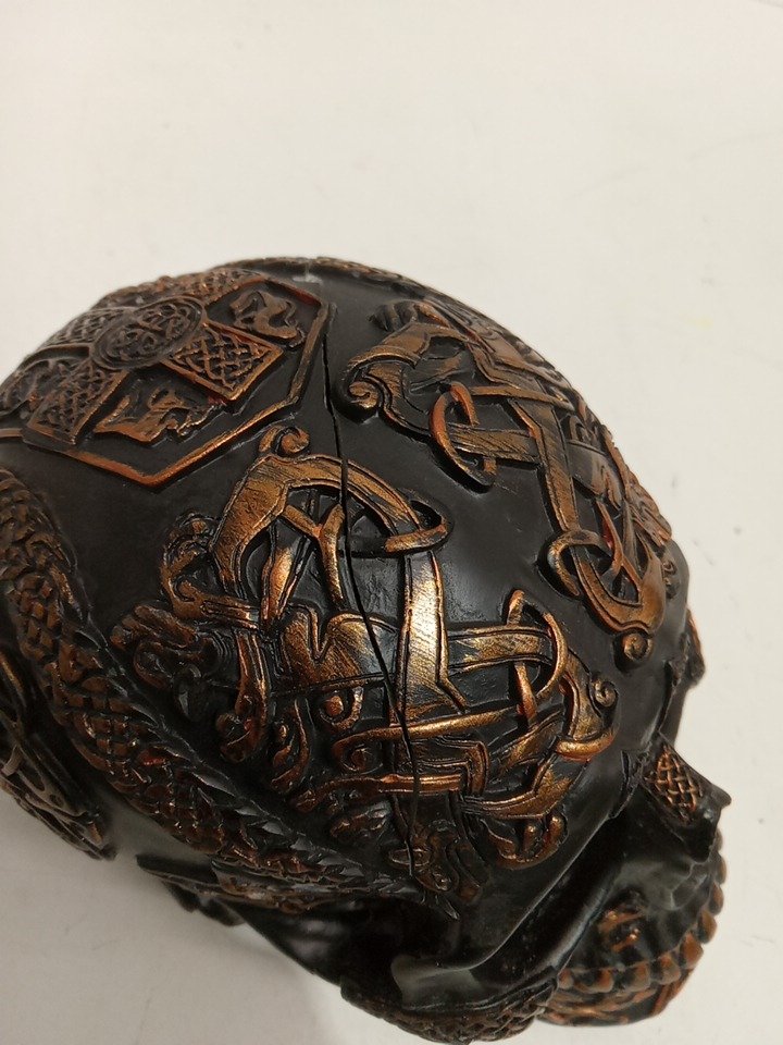 There is a crack running along its head and looks like a small piece is missing near its right jaw. can be used as a show piece. please see photos
