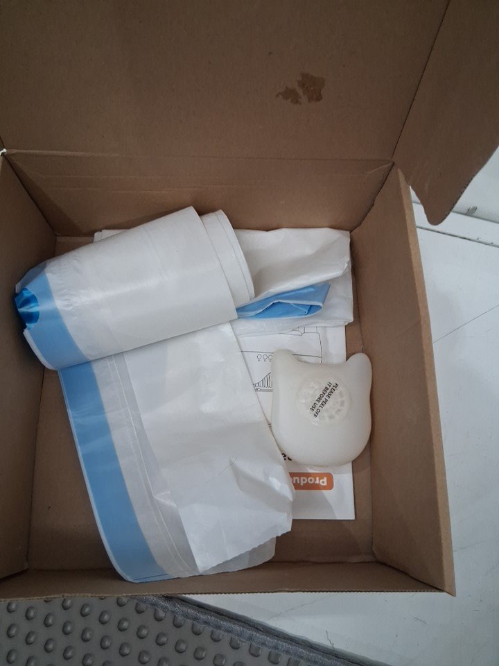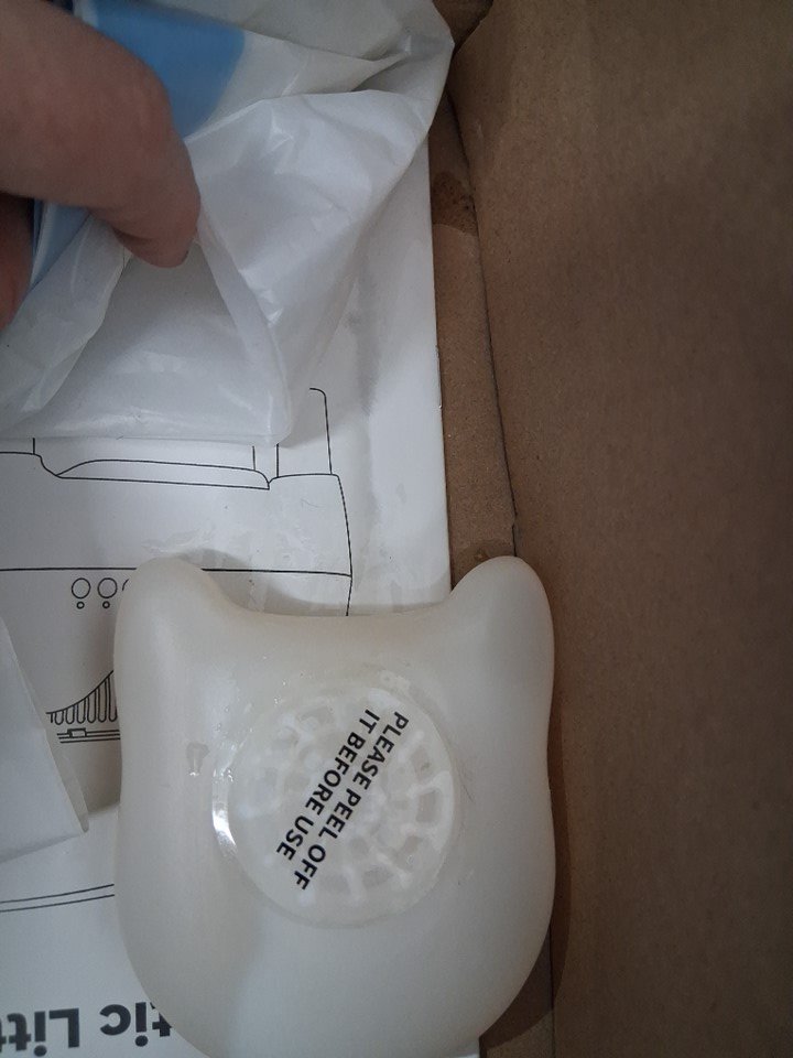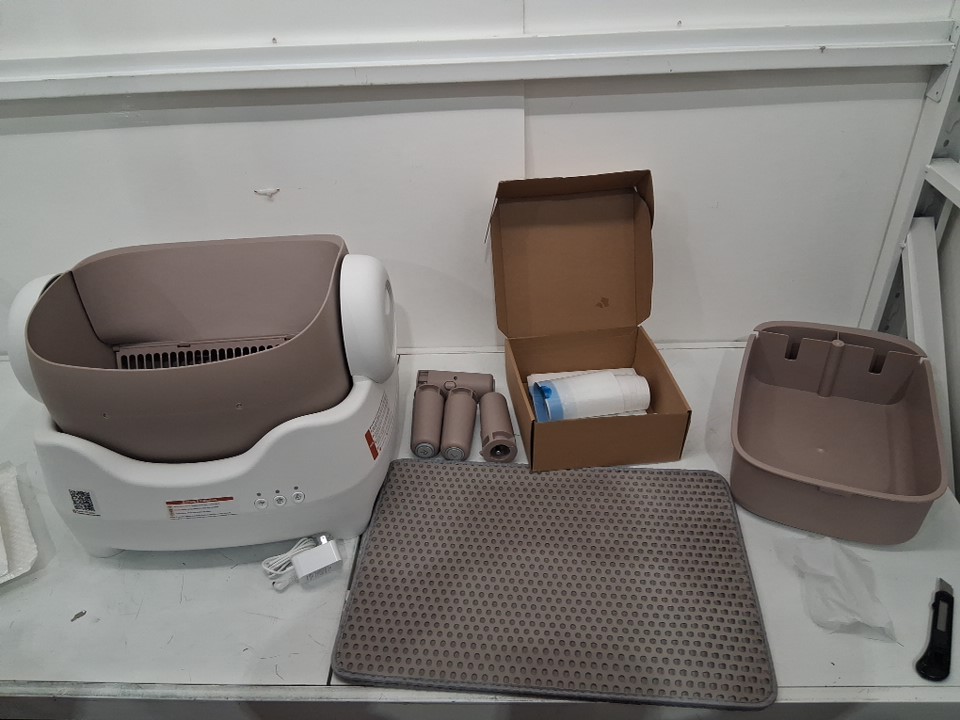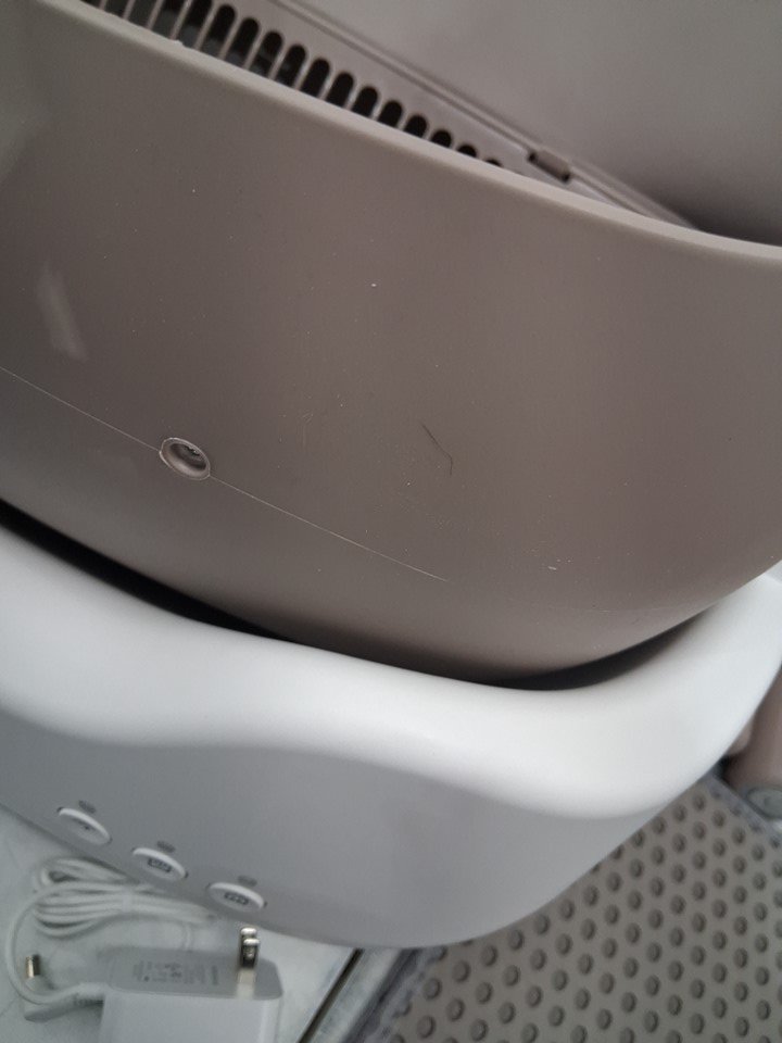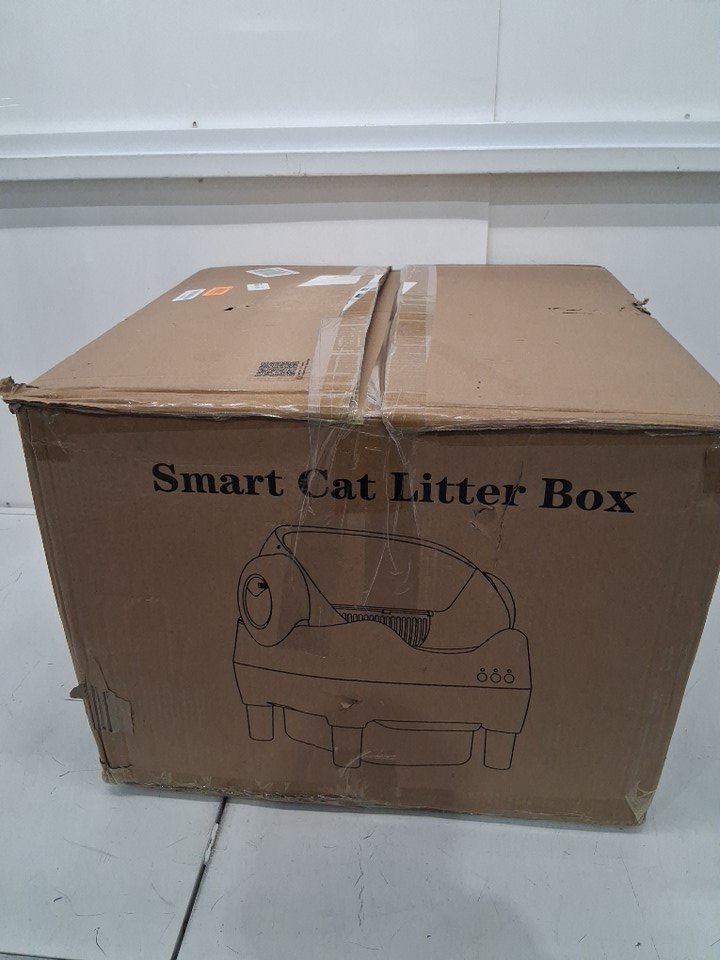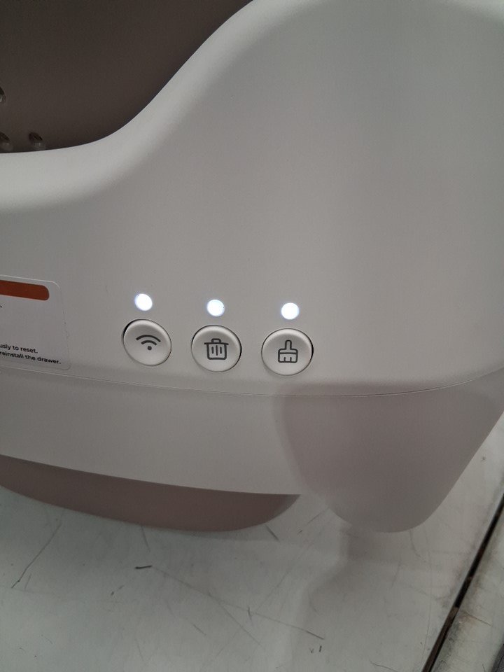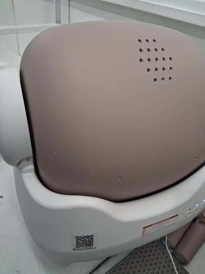 box has loose cat hair and light litter debris on outer cover. Scent booster is leaking. Has been tested for power and functionality