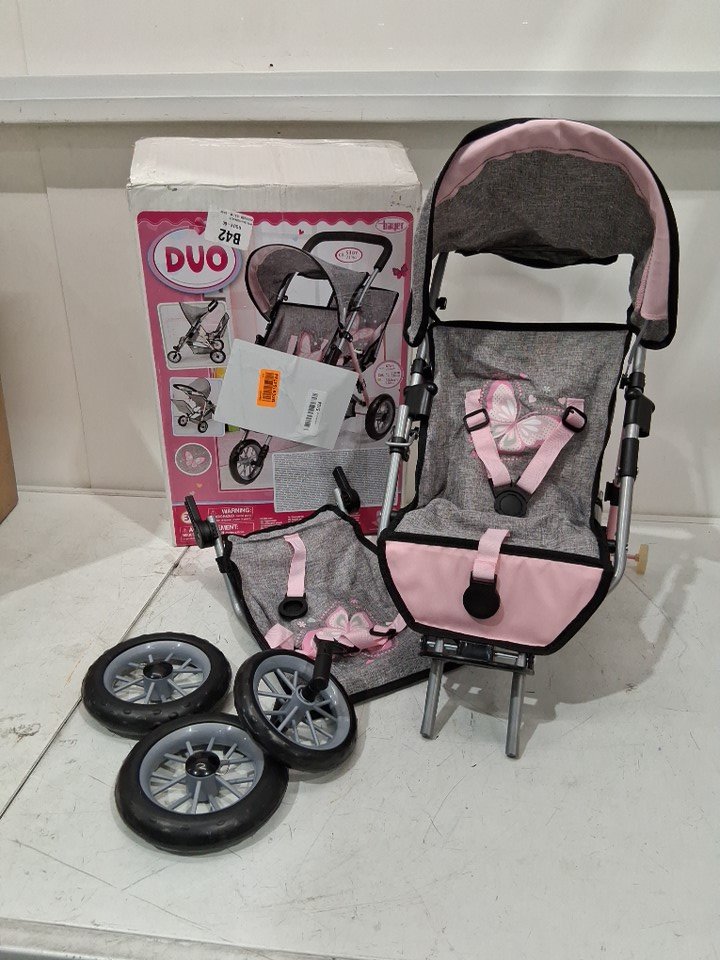 Bayer Duo Double Stroller for Dolls - Sun Canopy - Security Belt - Up to 18” - Grey / Pink