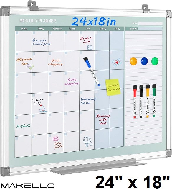 makello magnetic monthly calendar dry erase whiteboard - 24" x 18" - white/blue/green (model: ‎MWC6045)