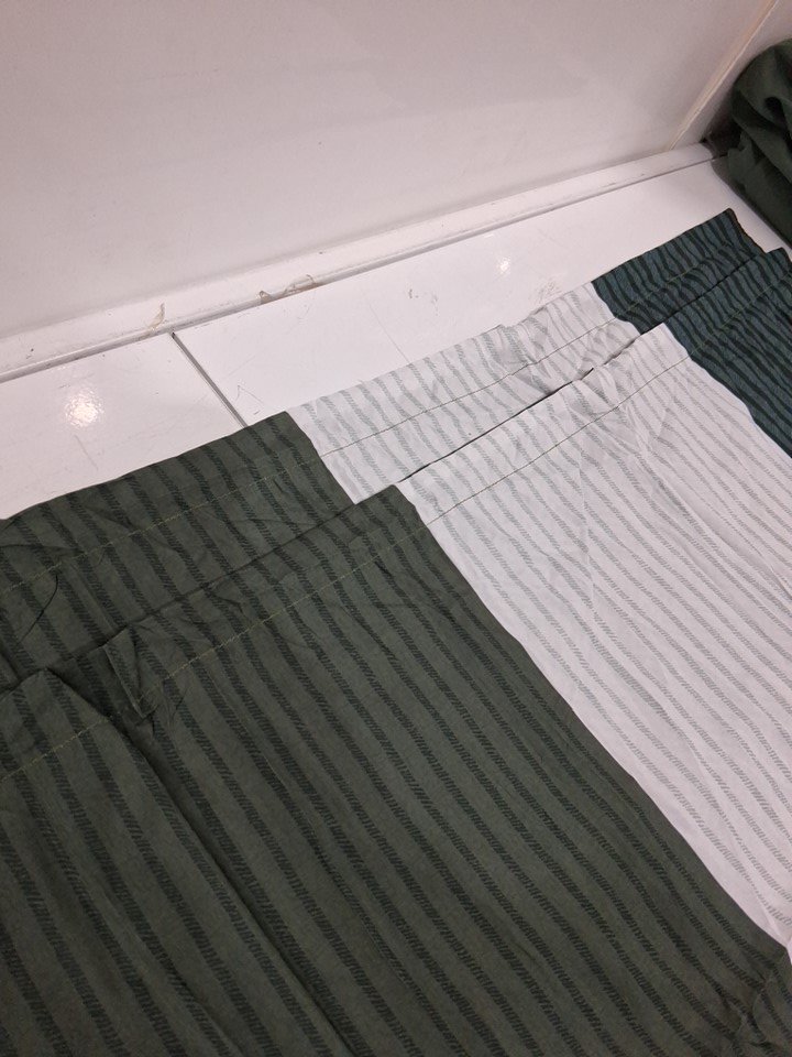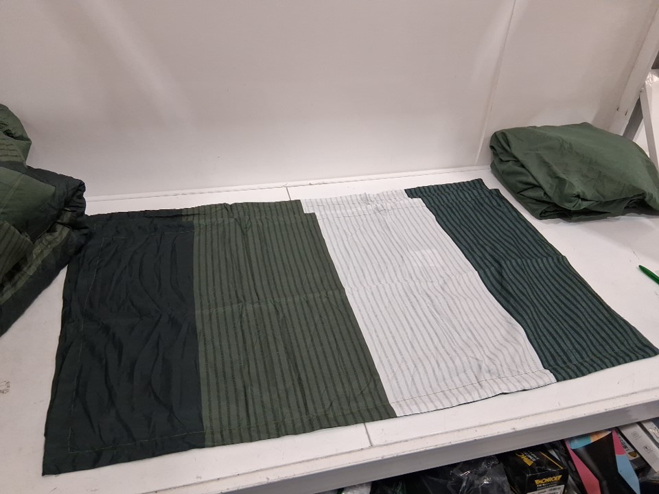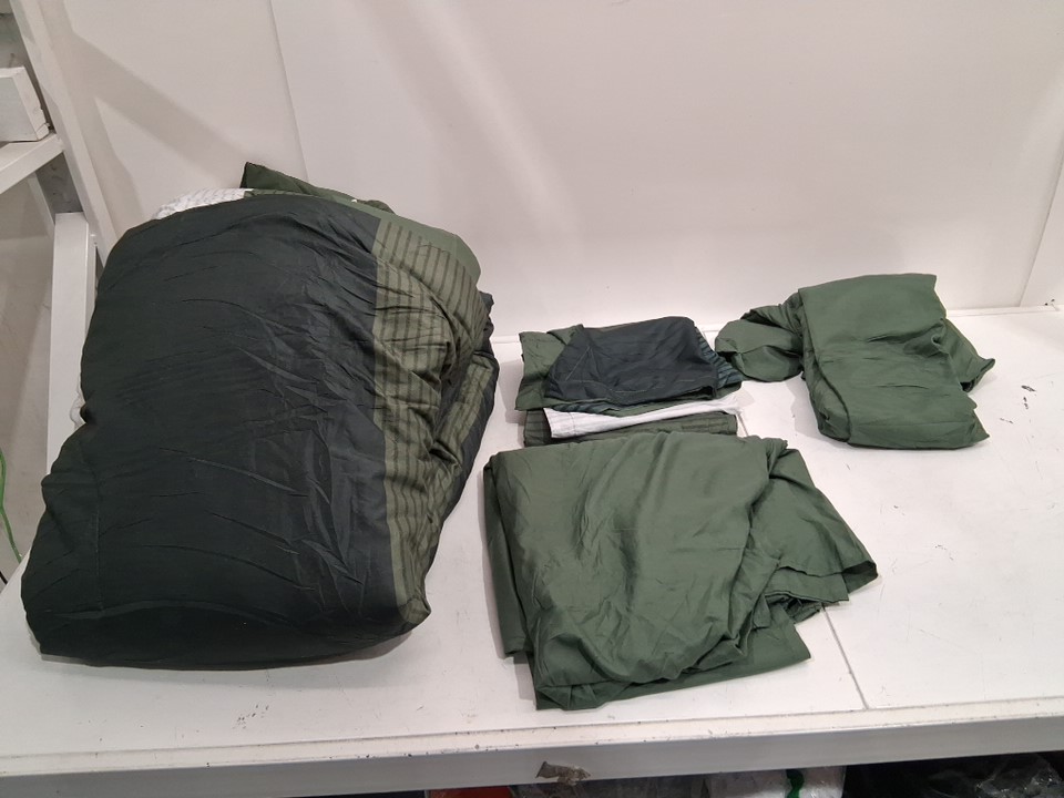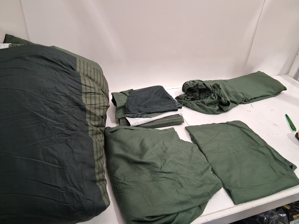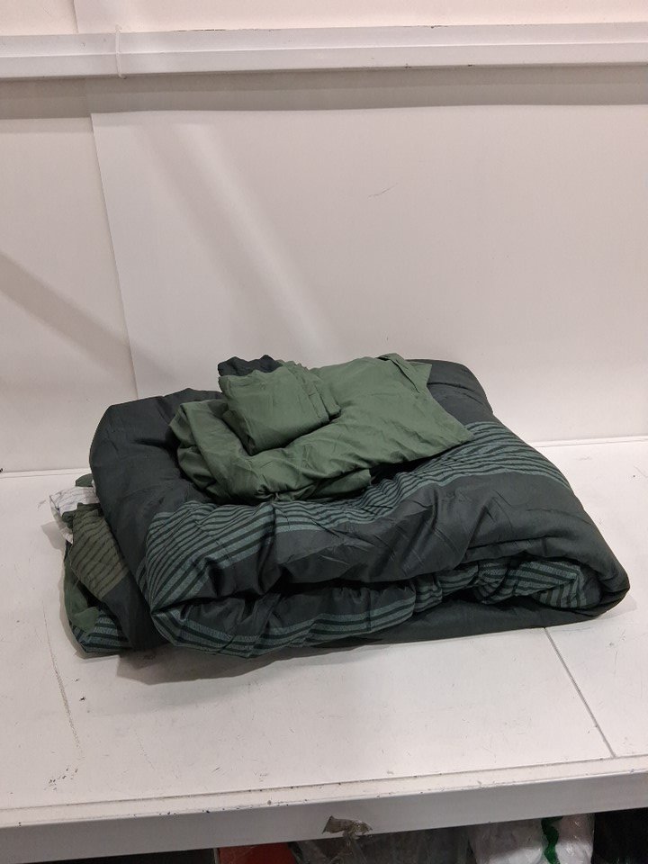 appears new, no scents, stains, etc. Includes: 2 pillowcases 1 fitted sheet 2 flat sheets and 1 duvet comforter.