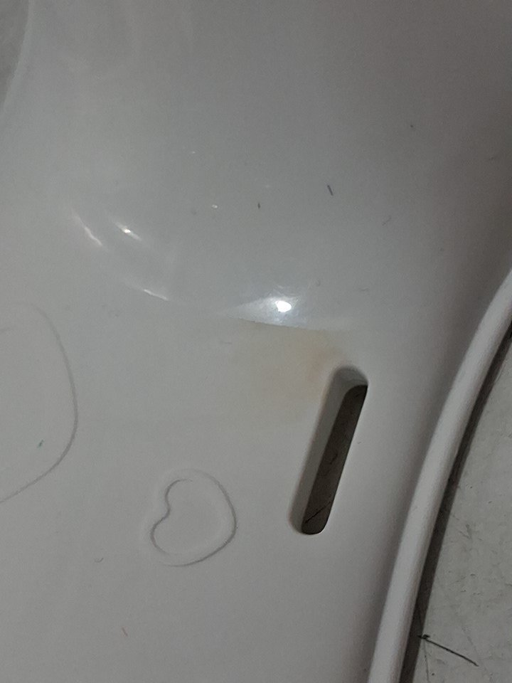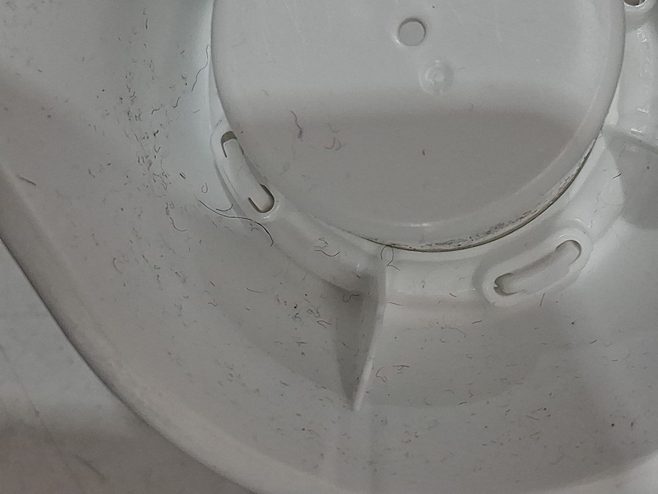 product has hairs, fibers and fuzz from previous light use and small stain on one of the small plastic white pieces (see photos)