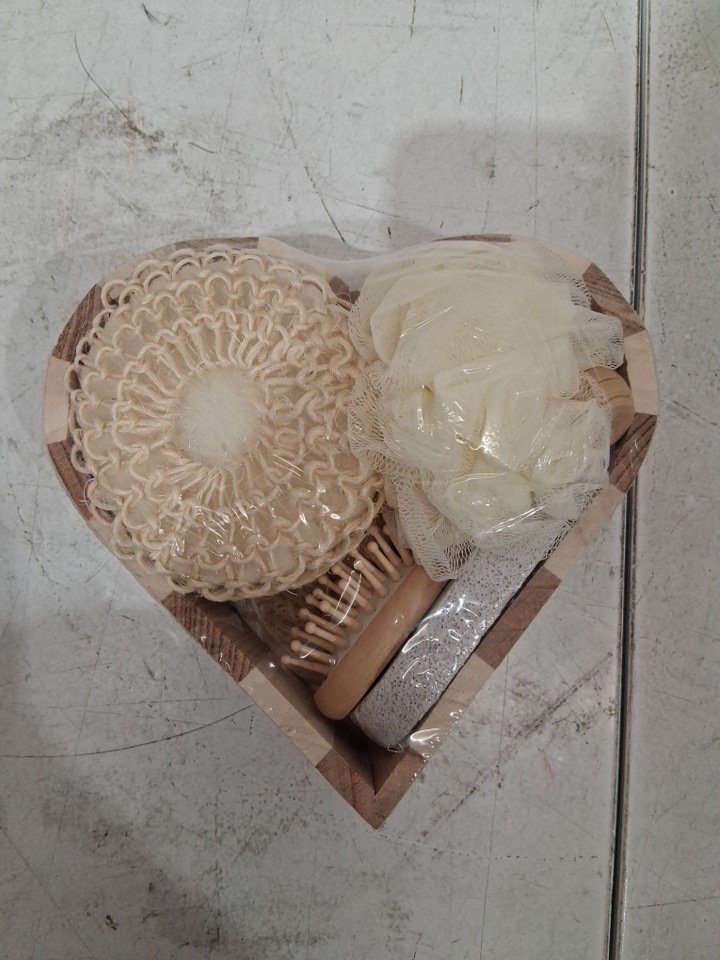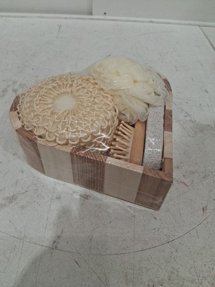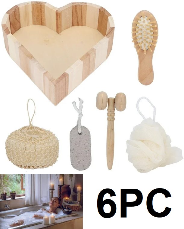 6PC BATH SHOWER home spa day relaxation set in heart tray - sisal bath sponge, pumice stone, comb, face massager, shower pouf - wood / naturals