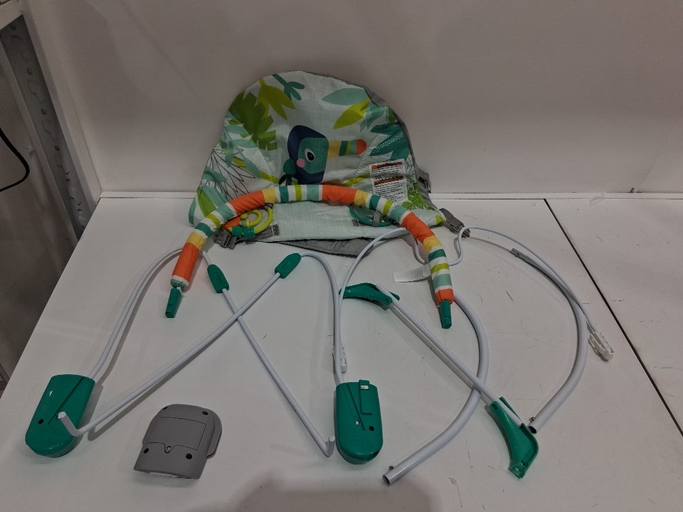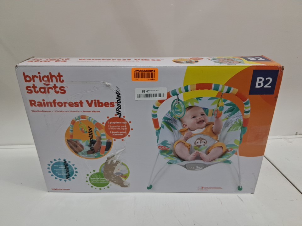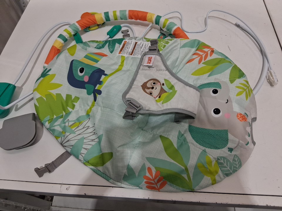 BRIGHT STARTS RAINFOREST VIBES PORTABLE 3-POINT HARNESS VIBRATING BOUNCER WITH TOY-BAR - RAINFOREST VIBES - (MODEL: 12227)