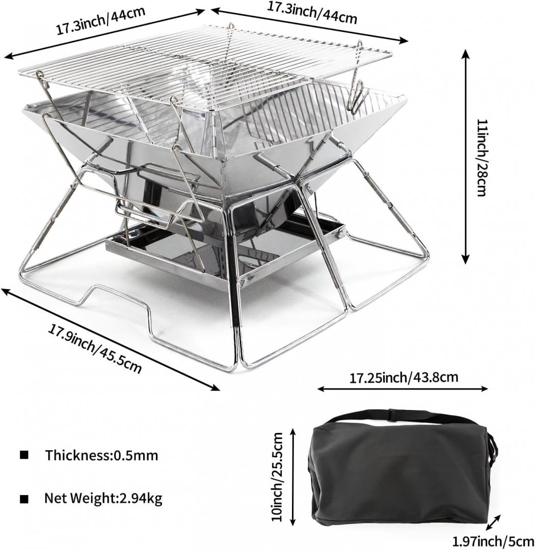ozhomy Collapsible Fire Pit and Grill with ashtray - 17.3" x 17.3" x 11" - stainless steel (model: ‎OZ-C0227)