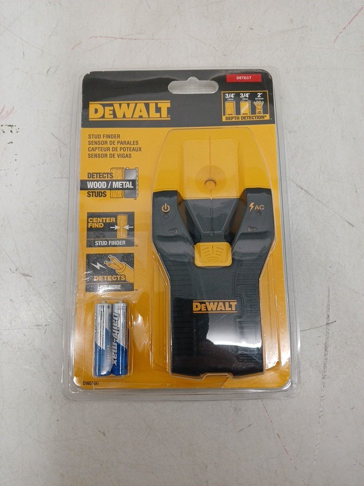 DEWALT STUD FINDER DETECTS METAL AND WOODEN STUDS AND LIVE WIRES - 3/4" RANGE FOR WOOD/METAL 2" FOR LIVE WIRE (MODEL: DW0100)