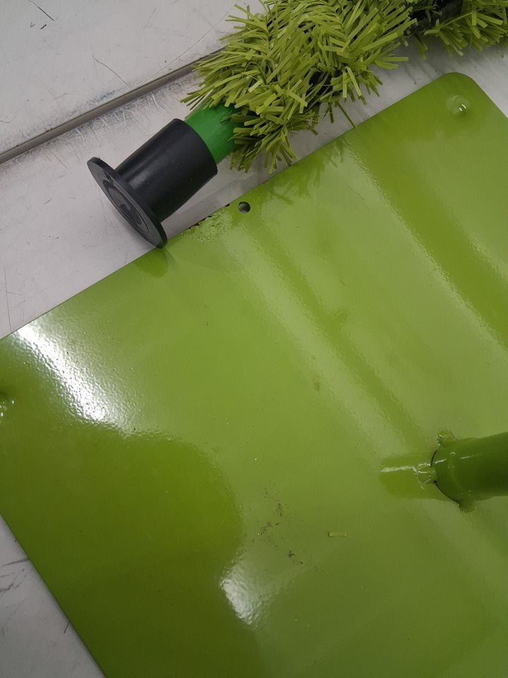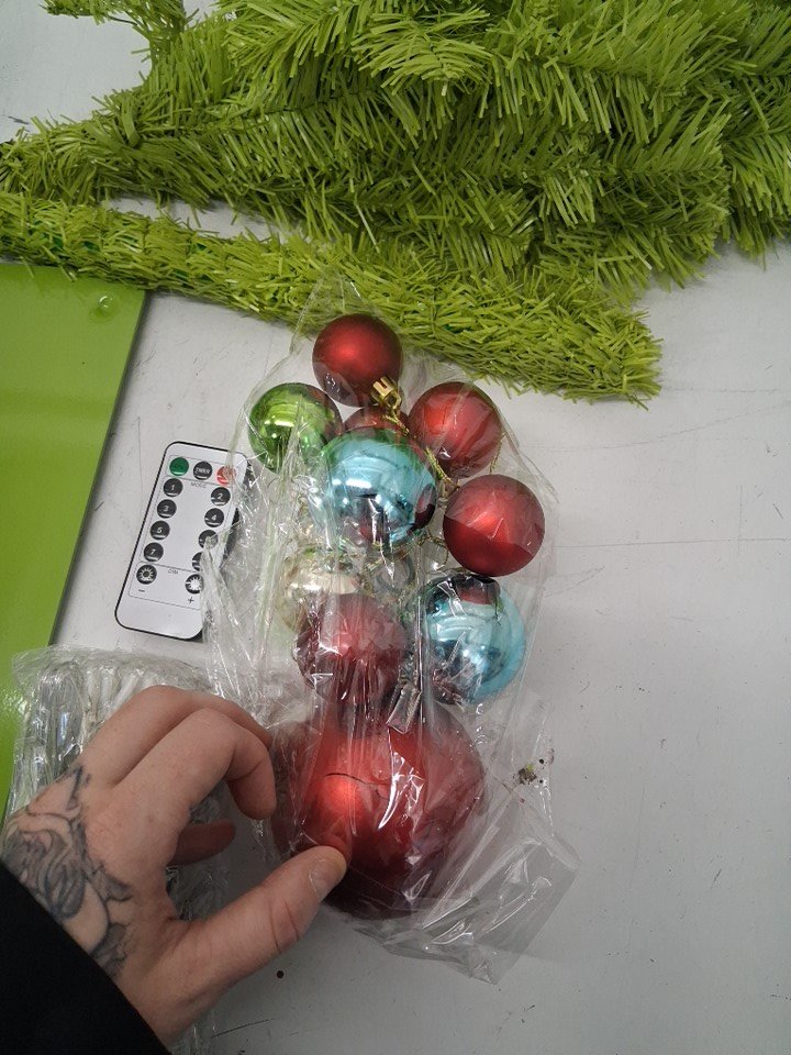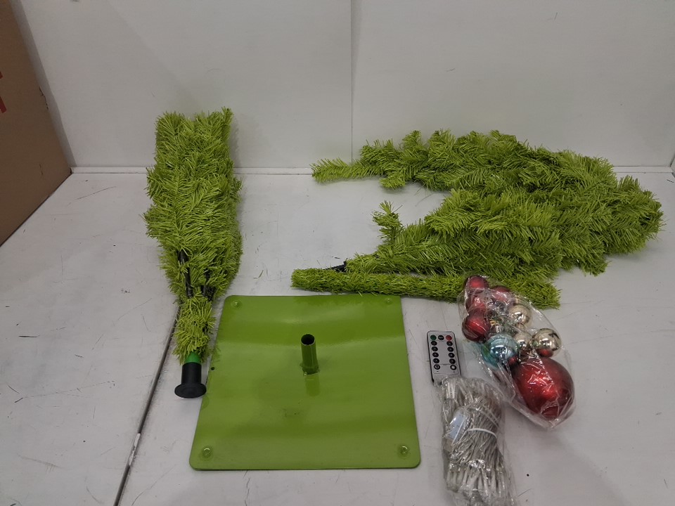 Stand has scuff marks/paint is rubbed off on surface. Lights are sealed, bag for ornaments are ripped
