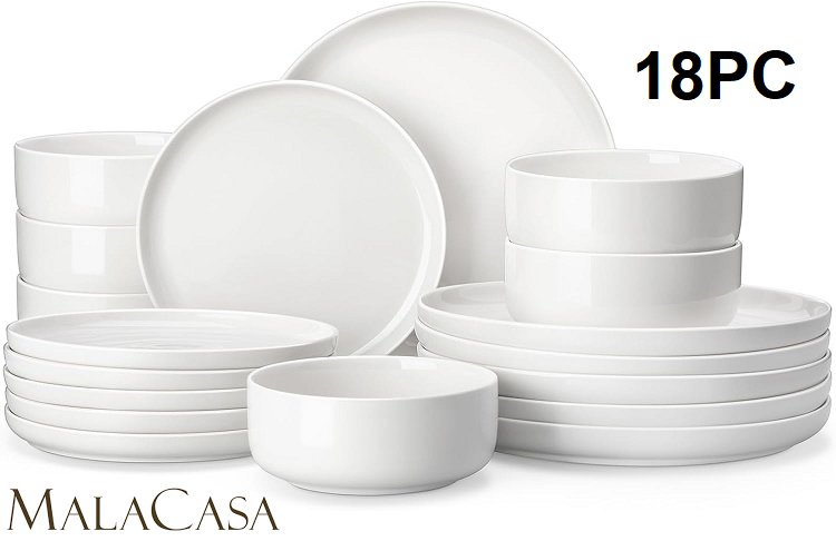 18pc MALACASA Plates and Bowls Porcelain Dinnerware Sets Dishware Sets Chip Resistant Ceramic Dish Set - serves 6 - white - (model: luna-18 )