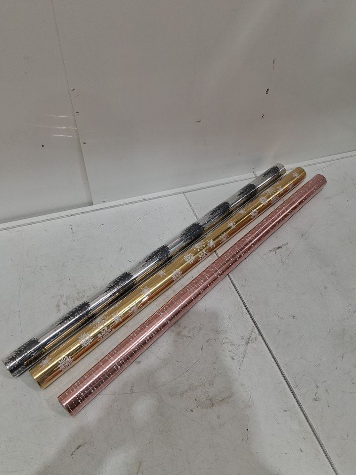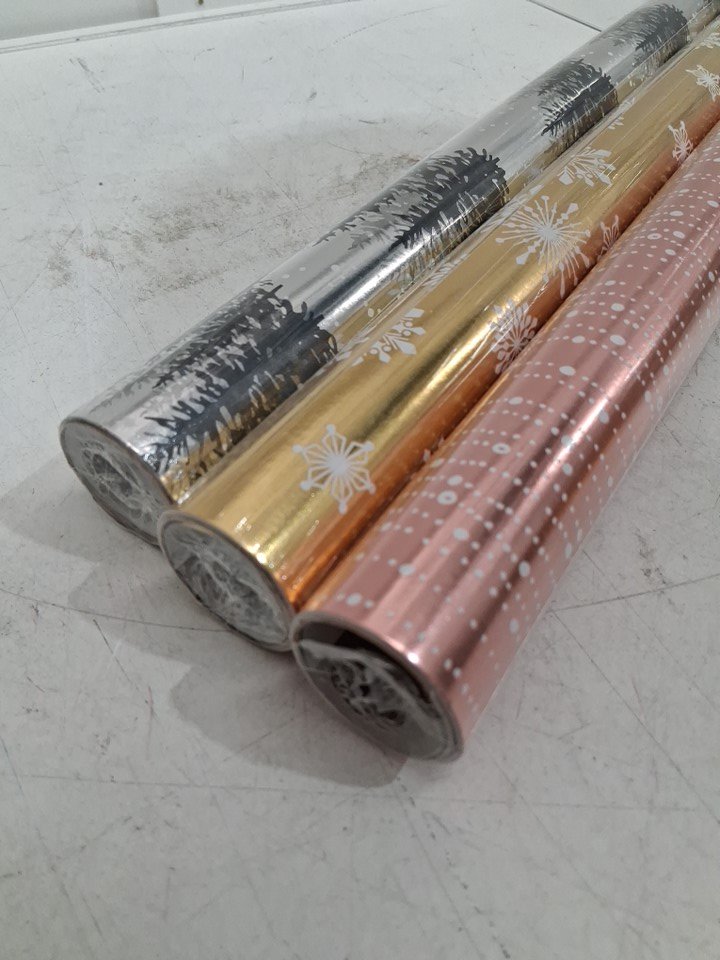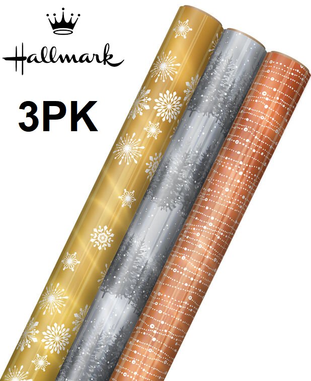 3pk hallmark metallic patterned Christmas wrapping paper - gold snowflakes / copper beads / silver trees