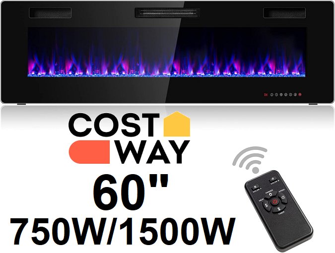 COSTWAY Electric Fireplace insert with Remote Control, 12 Flame Colors, 5 Brightness Settings and Timer - 60" x 15" x 24" - 750W/1500W - black (MODEL: ep24706)