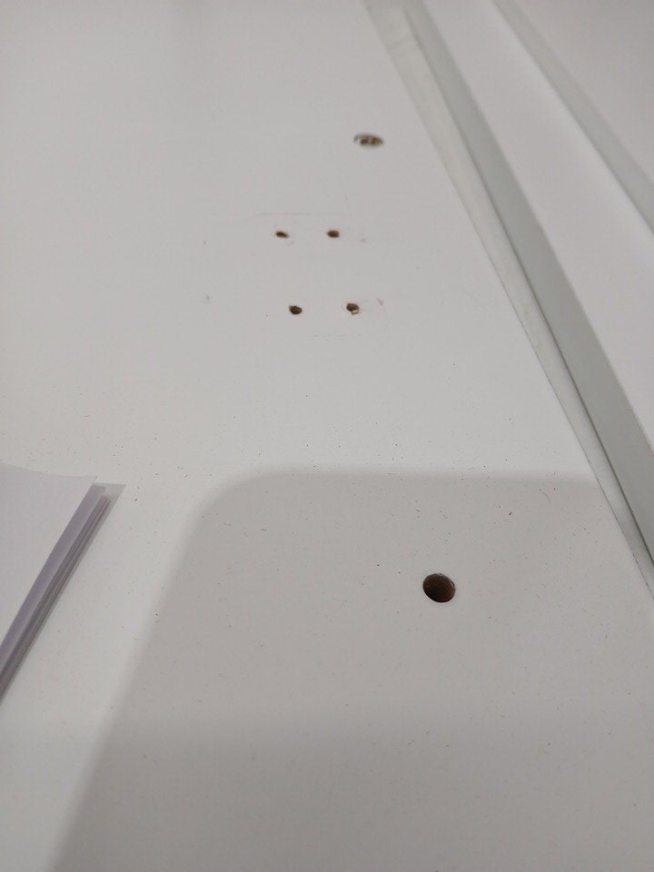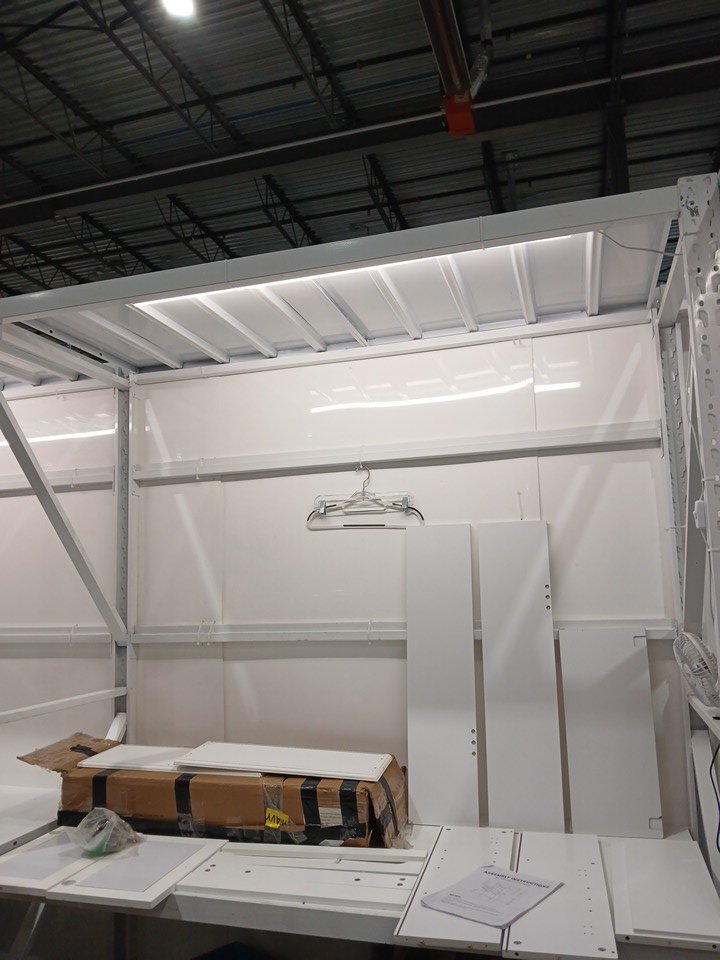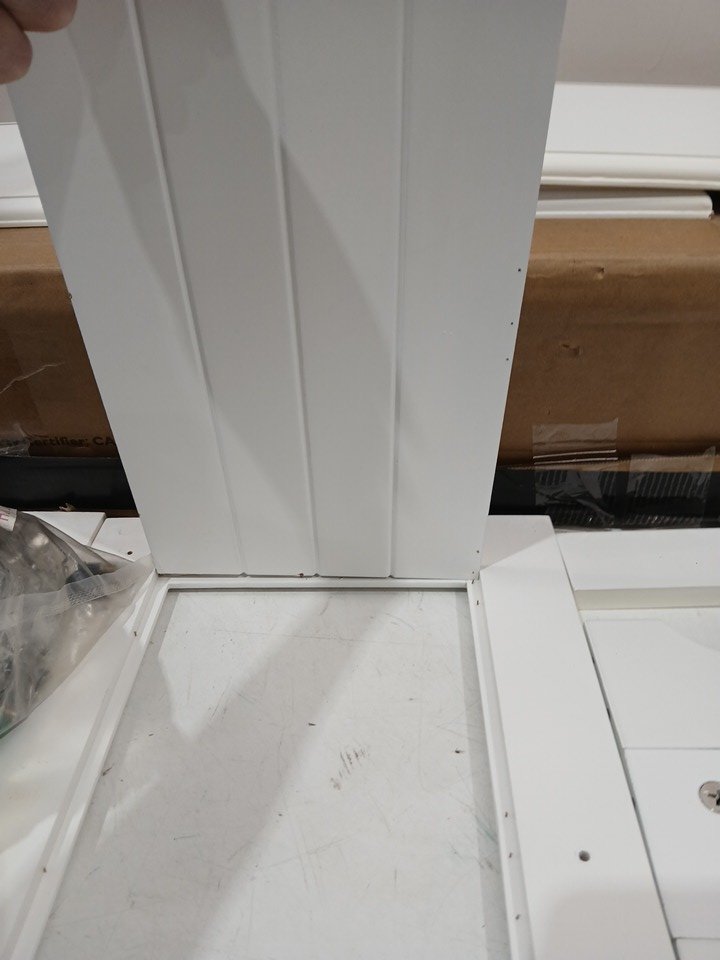 Was previously assembled and the pieces have scuffs and scratches/minor chipping. May be missing some hardware. The panel on the doors need to be staples back in.