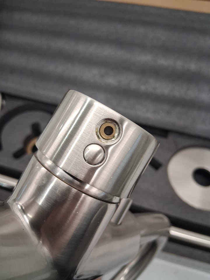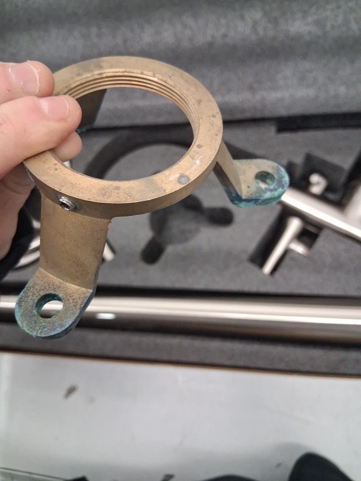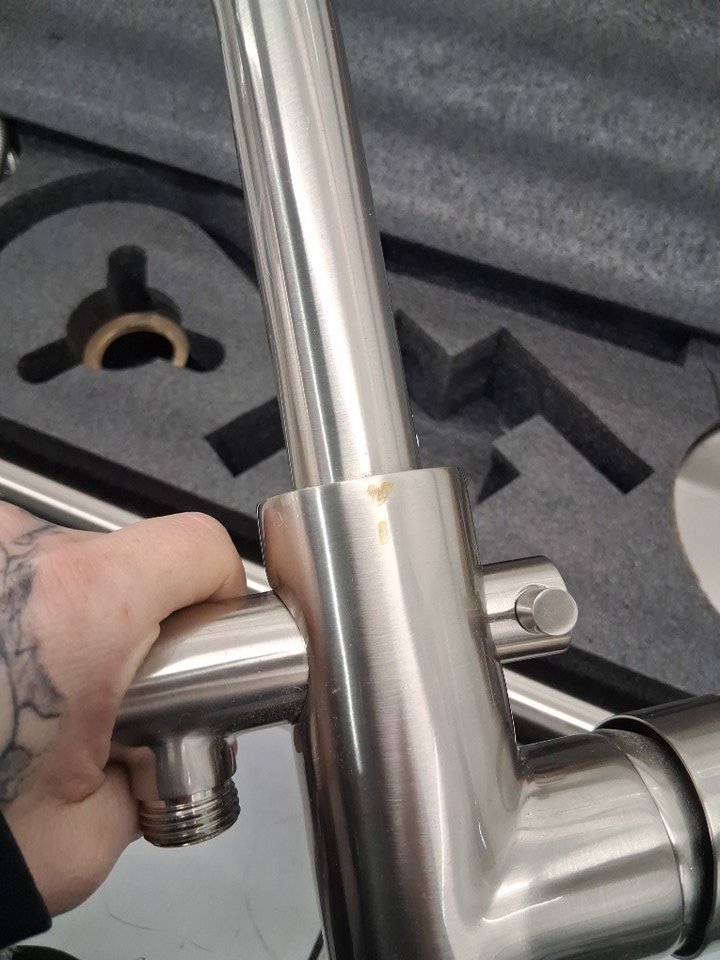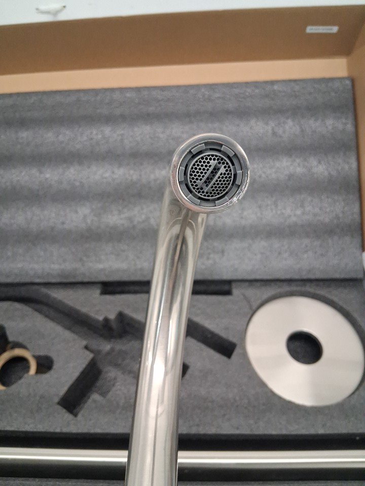 Tub filler has visible water spots and stains on it. Handle for faucet is missing.