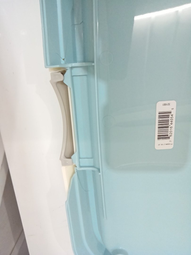 There are light scuffs from transport without proper packaging, and the underside at one of the handles has been damaged. That side is still able to close but not as firmly as the other.