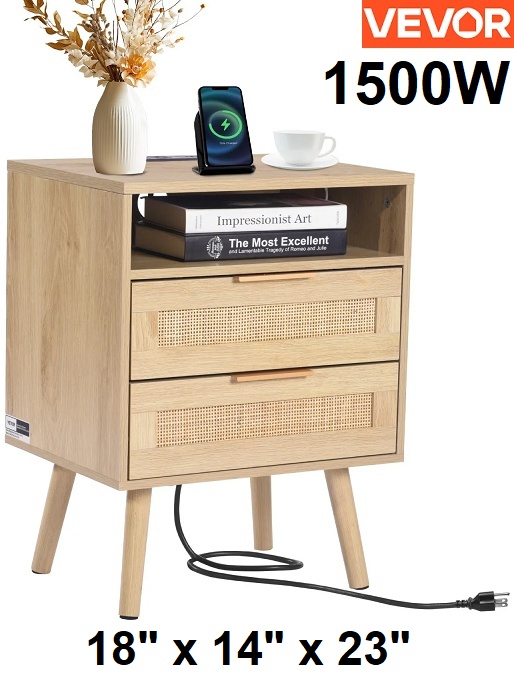 vevor rattan nightstand with charging station - 1500w - 18" x 14" x 23" - wood (model: SR248011-US--1PC)