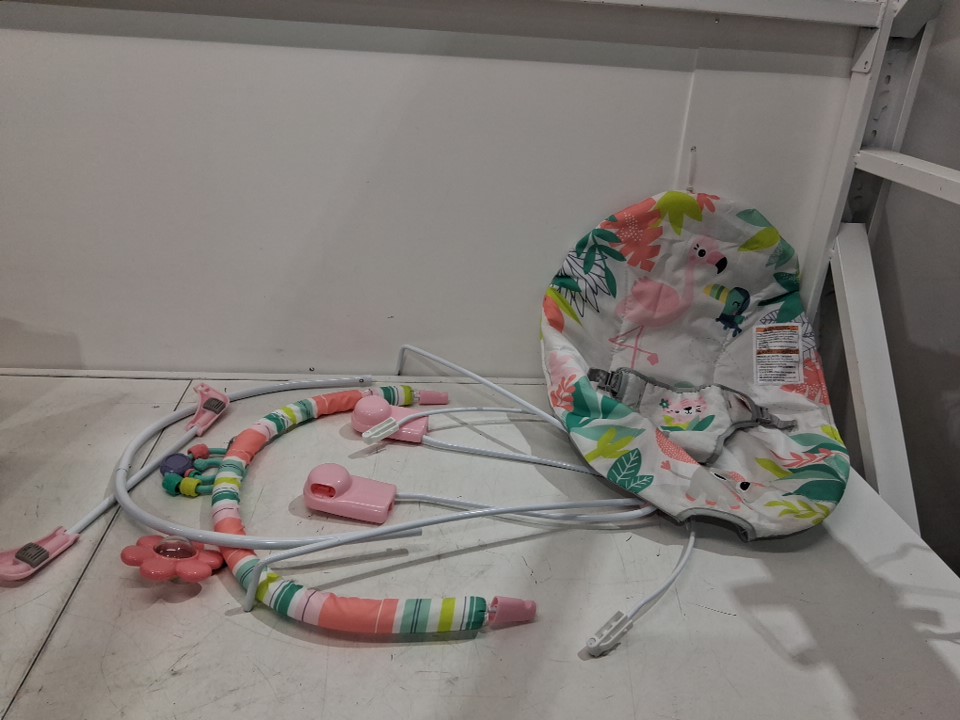 BRIGHT STARTS 3-POINT HARNESS HARNESS VIBRATING BABY BOUNCER WITH-TOY BAR - FLAMINGO VIBES - multicolour (MODEL: 12228)