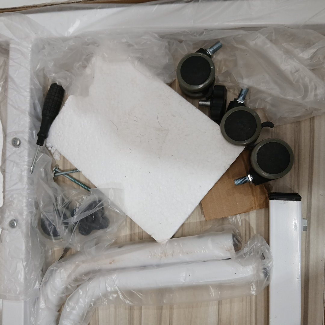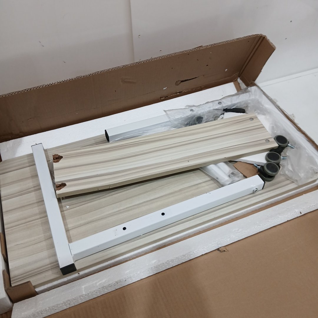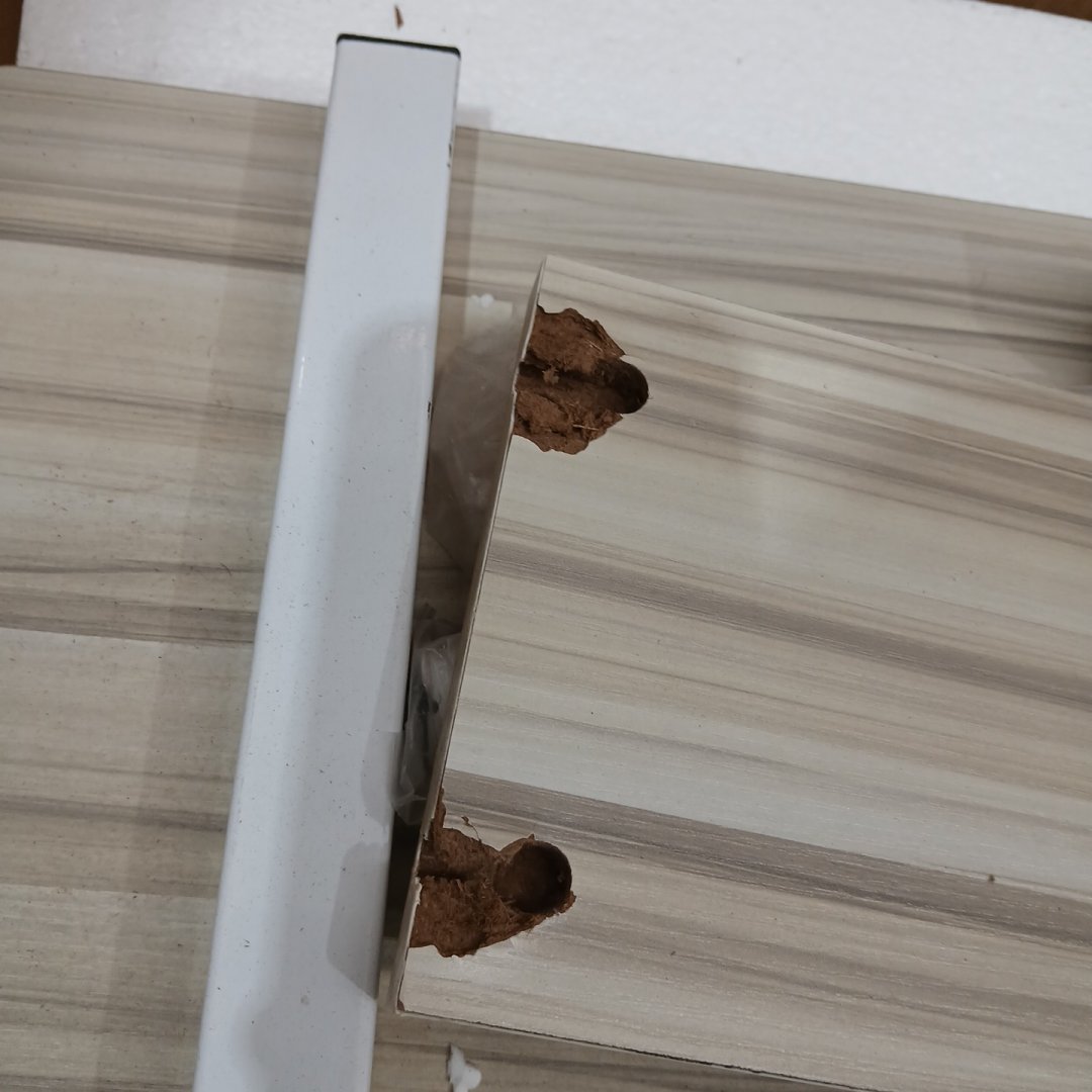 Heavy damage to the one back board, as well as signs of previous assembly. Light discoloration on the white visible.
