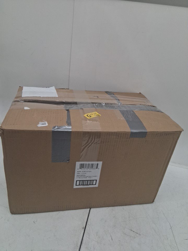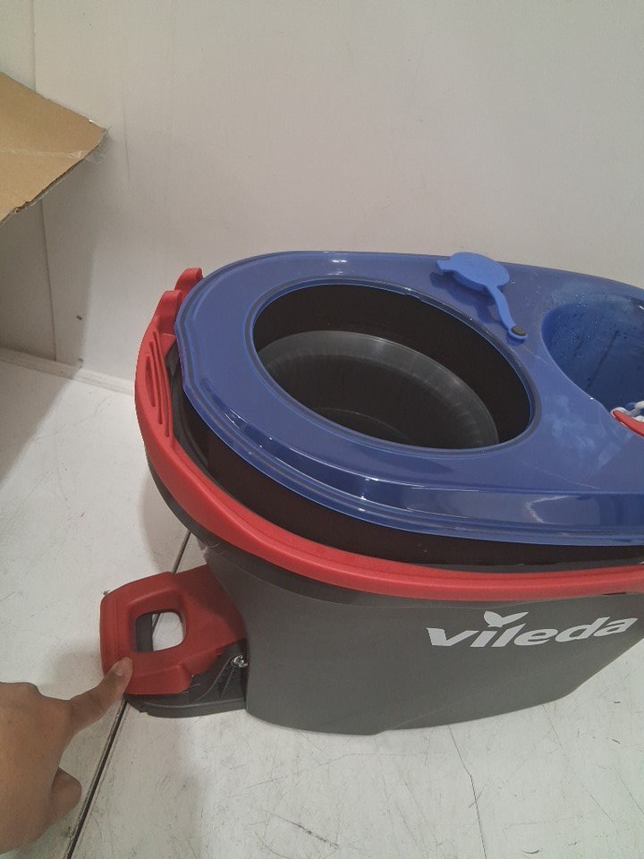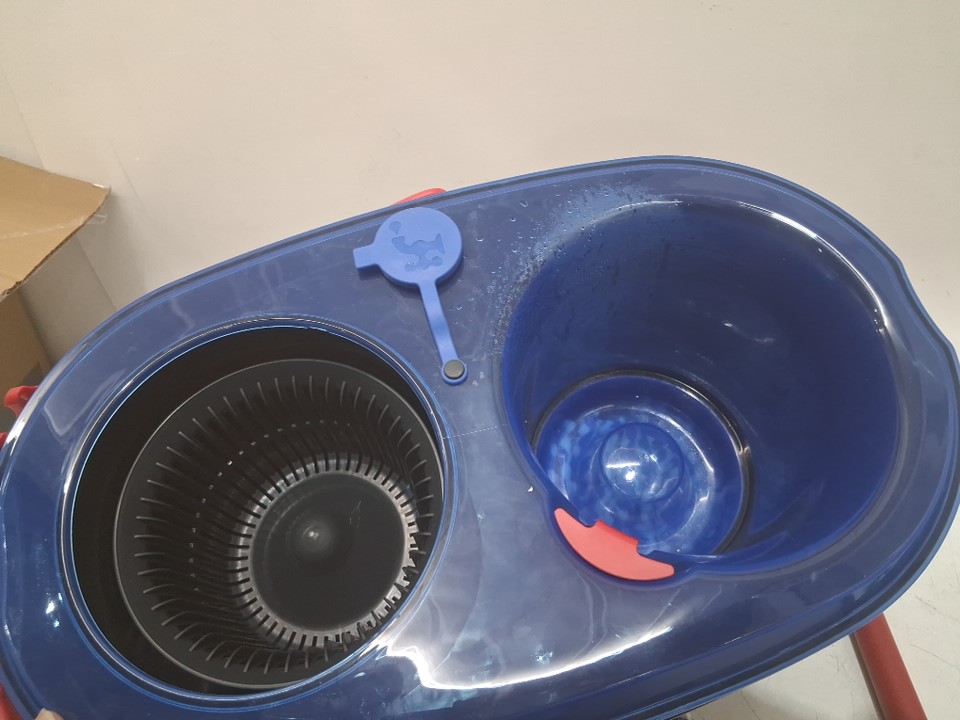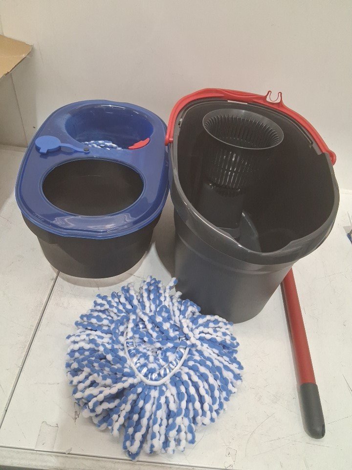 Item has some water residue and one of the mop heads is little wet. There is also some light scuffing from previous use.