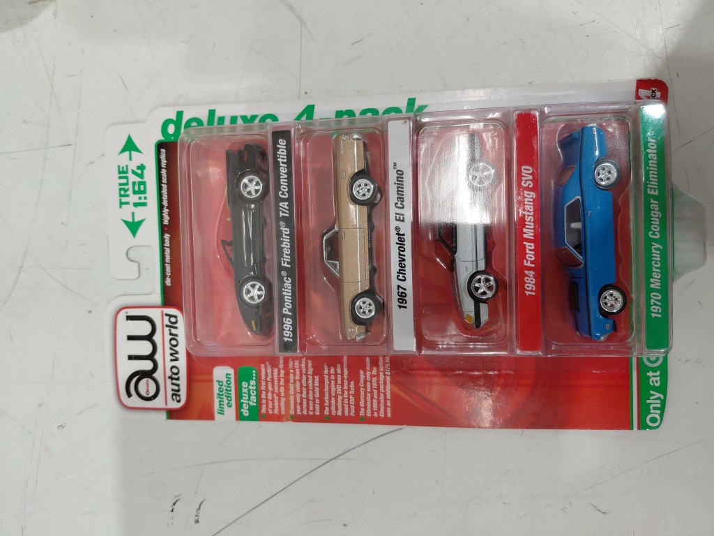 4pk Auto World 2022 Deluxe CARS Release 2 Version A - 1996 Pontiac firebird/1967 chevorlet el camino/1984 ford mustang svo/1970 mercury cougar eliminator