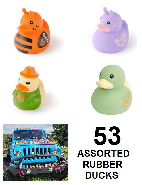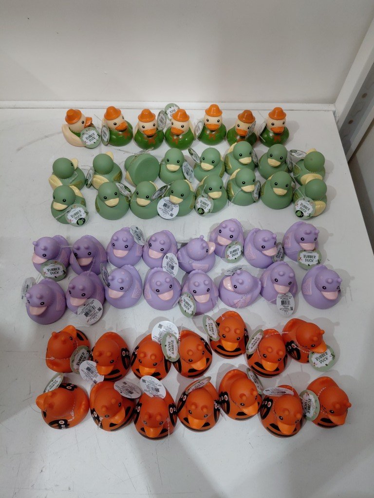 53 ASSORTED RUBBER DUCKS - 2.5" - ORANGE, GREEN, PURPLE, YELLOW