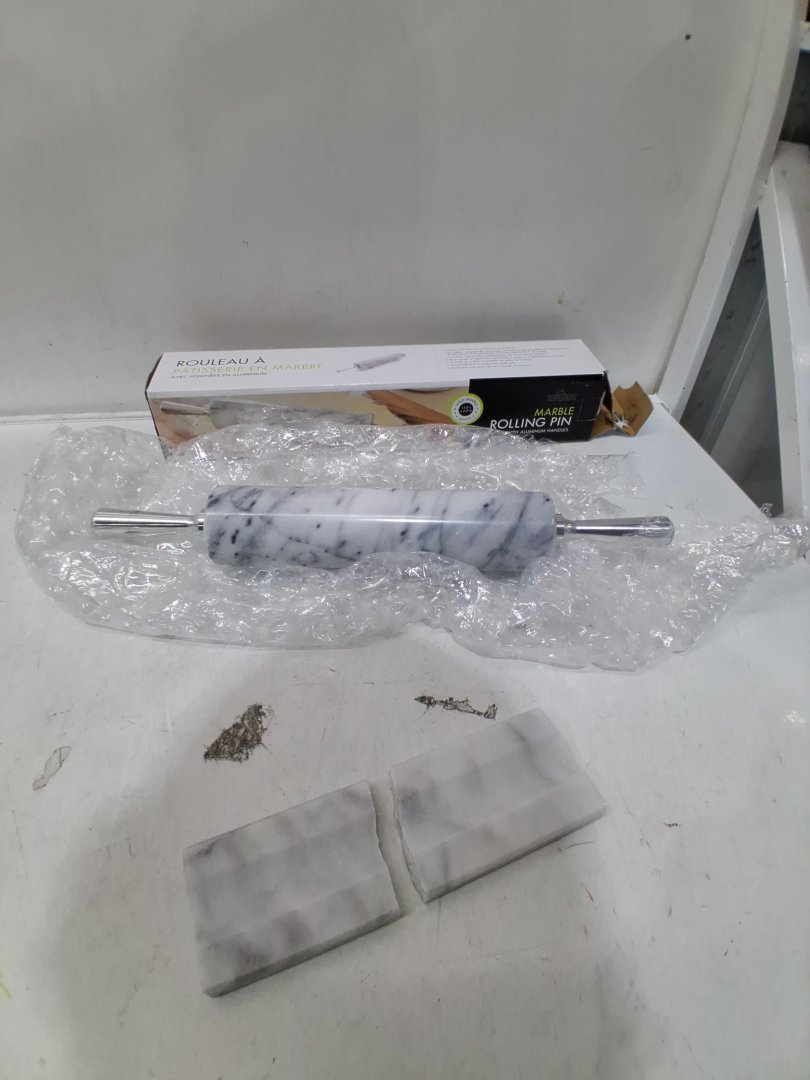 Rolling pin holder is broken. Small mark on handle likely from shipping.