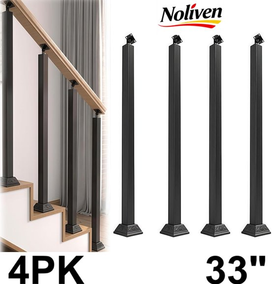 4PK Noliven Square Stair Baluster Posts WITH , Adjustable 270° Angle Bracket - 33" - BLACK