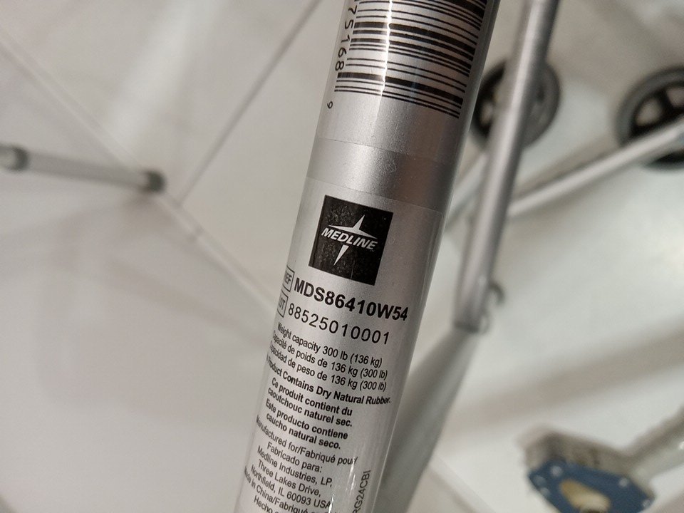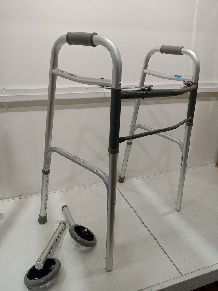 medline 2 button folding walker - 5'' wheels - 300lb capacity - Silver (model: mds86410w54h)