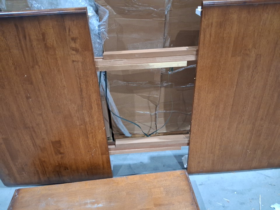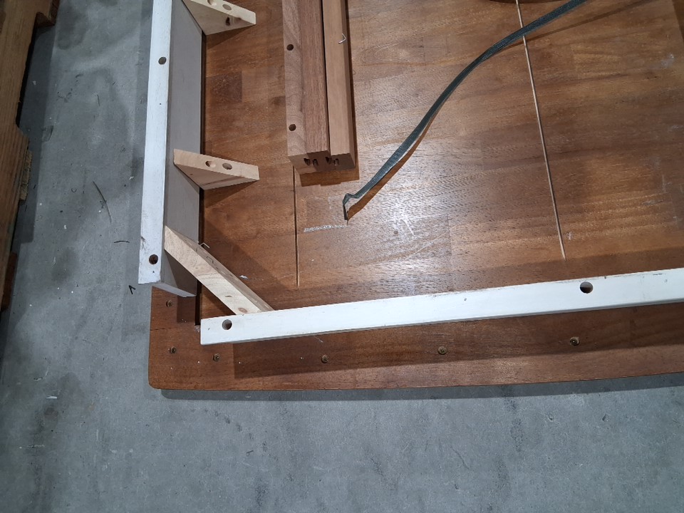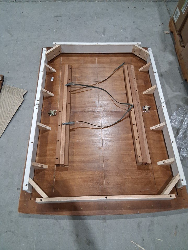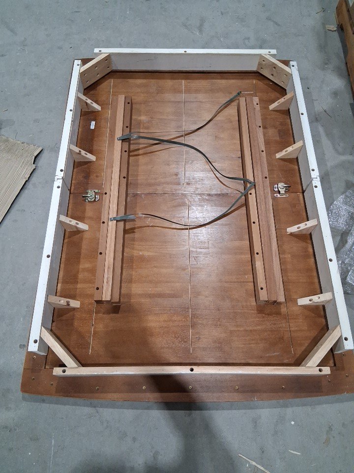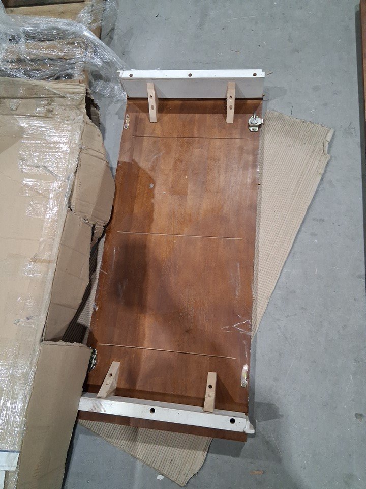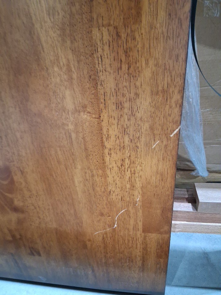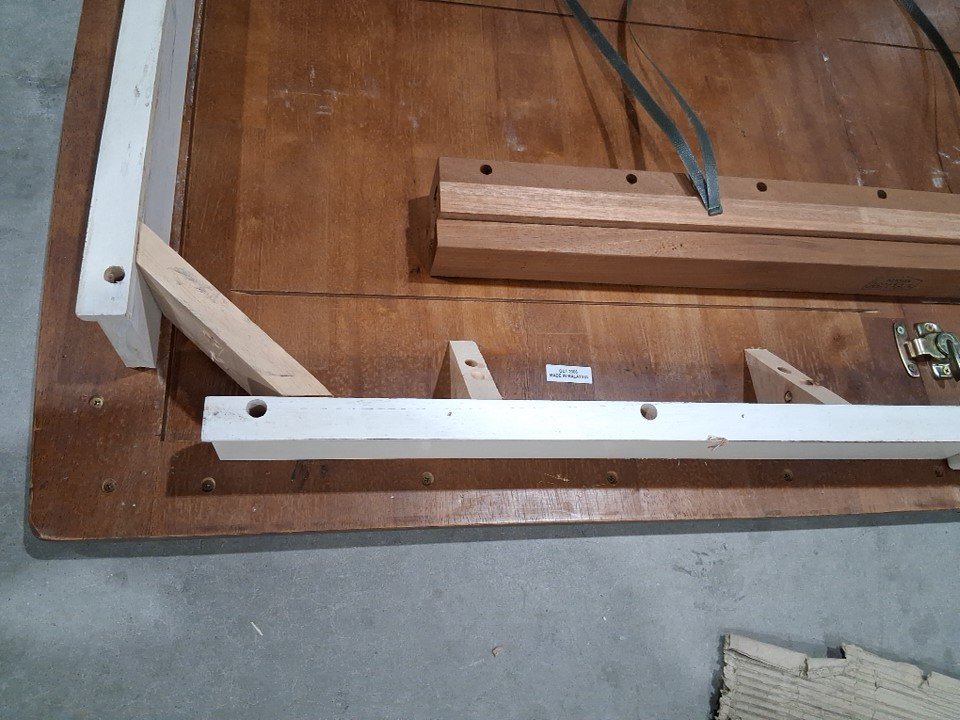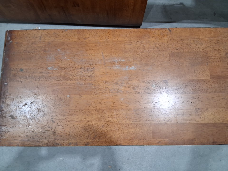 Table top is missing all 4 legs and has various scratches on the underside and surface. Mostly it is the leaf that will require some cleaning up as it has some surface level dust/dirt stains