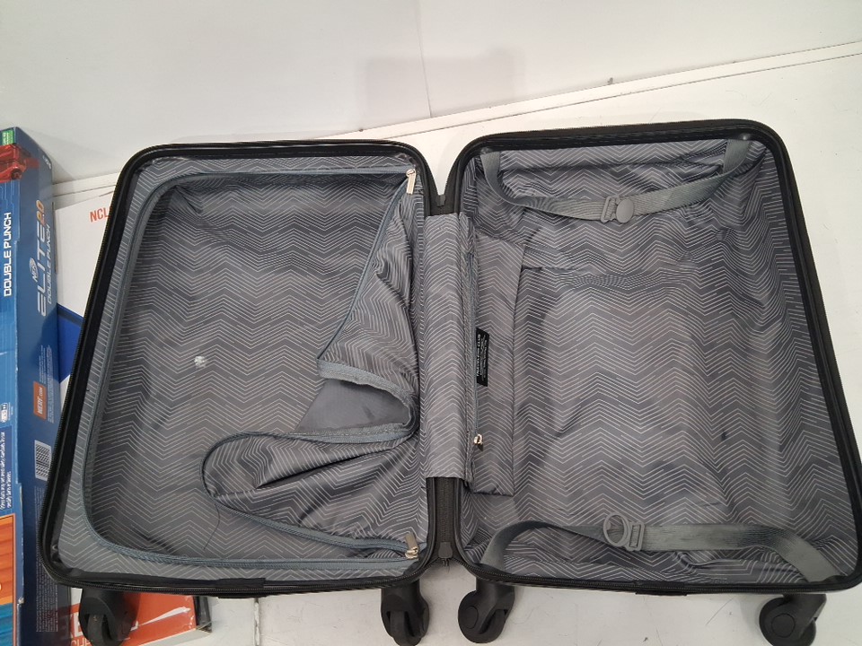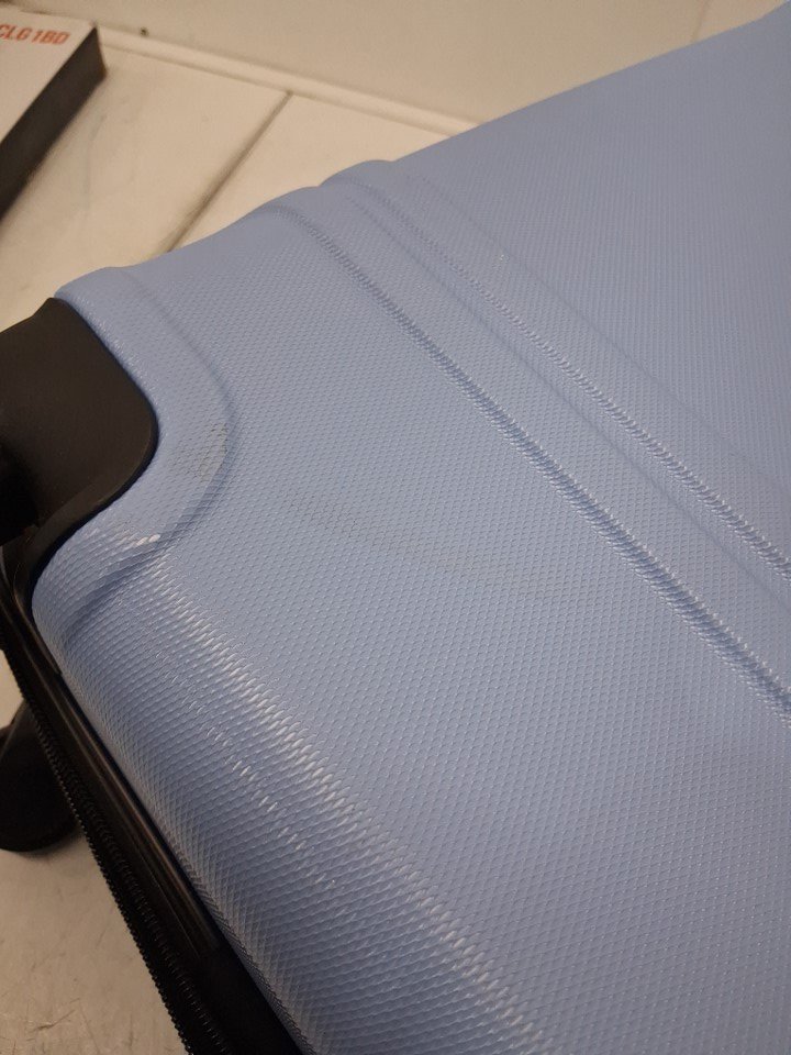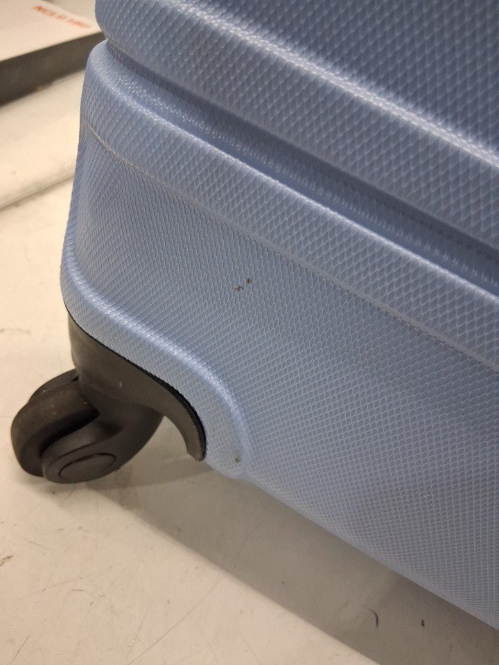 Suitcase has some scuff marks on it, wheels have visible dirt on them, there is a toothpaste stain on inside