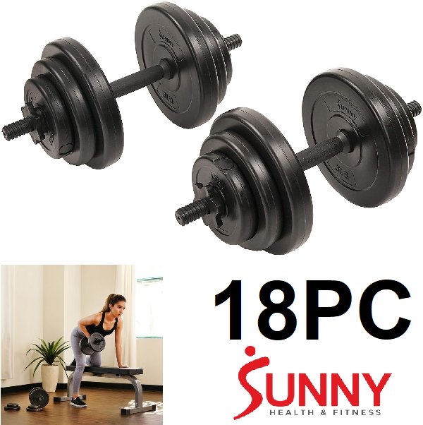 18PC Sunny Health & Fitness 2 Dumbbell Set, Black - x2 Barbells, x4 Star Lock Collars, x4 1.5LB Weights, x4 2.5LB Weights, x4 5LB Weights