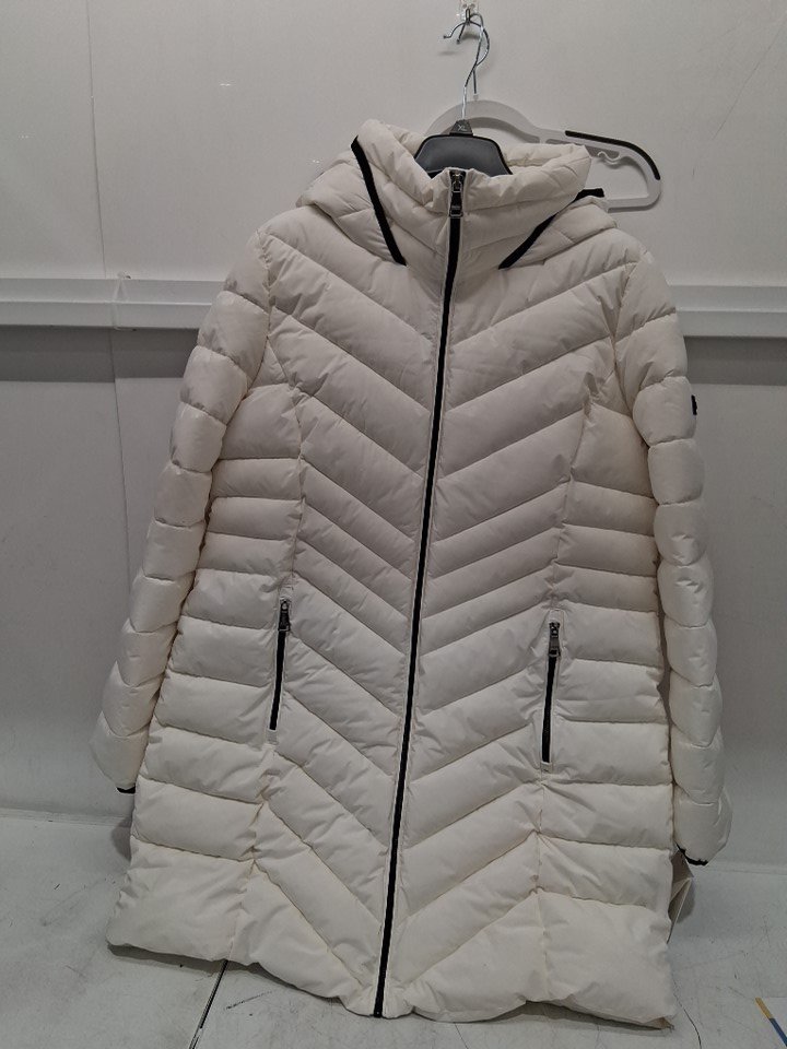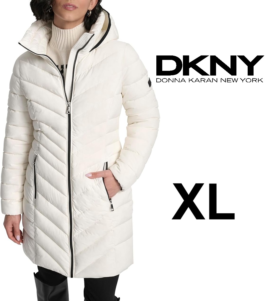 WOMEN'S DKNY Insulated Long Lightweight Hooded Puffer Jacket - XL - PEARL WHITE (STYLE: DL5MPY41)