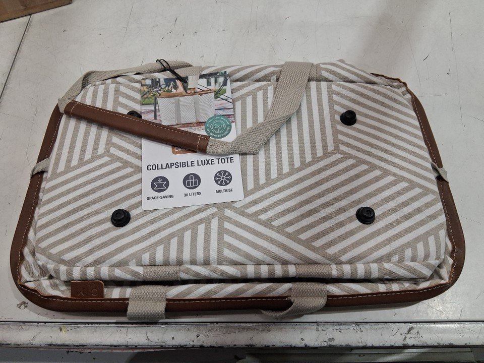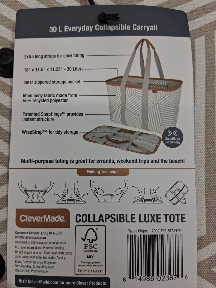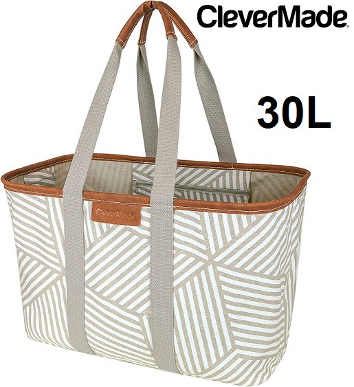 CLEVERMADE COLLAPSIBLE SNAPBASKET LUXE TOTE - HEAVY DUTY LARGE - 30L - TAUPE STRIPES (MODEL: 7002-TPE-STRP)