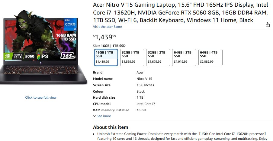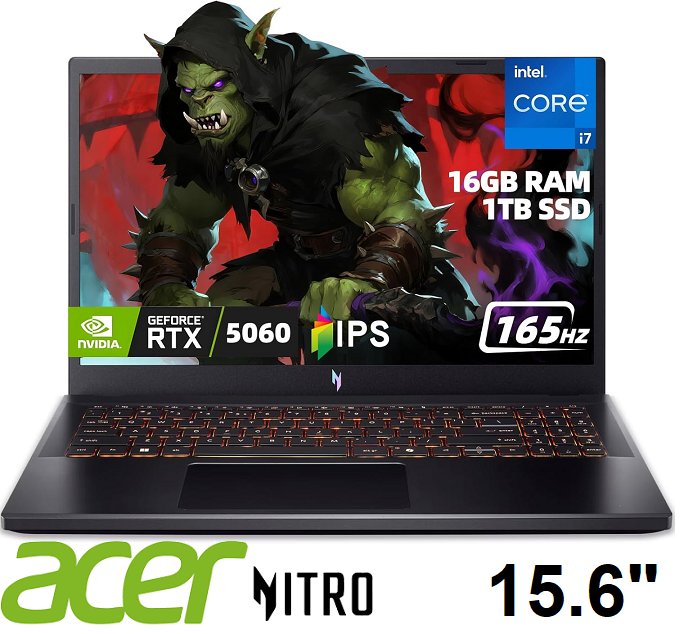acer nitro v 15 gaming laptop - 15.6" fhd | 165hz | intel i7-13620h | 16gb ram | 1tb ssd | rtx 5060 8gb - black - (model: anv15-52-798z)