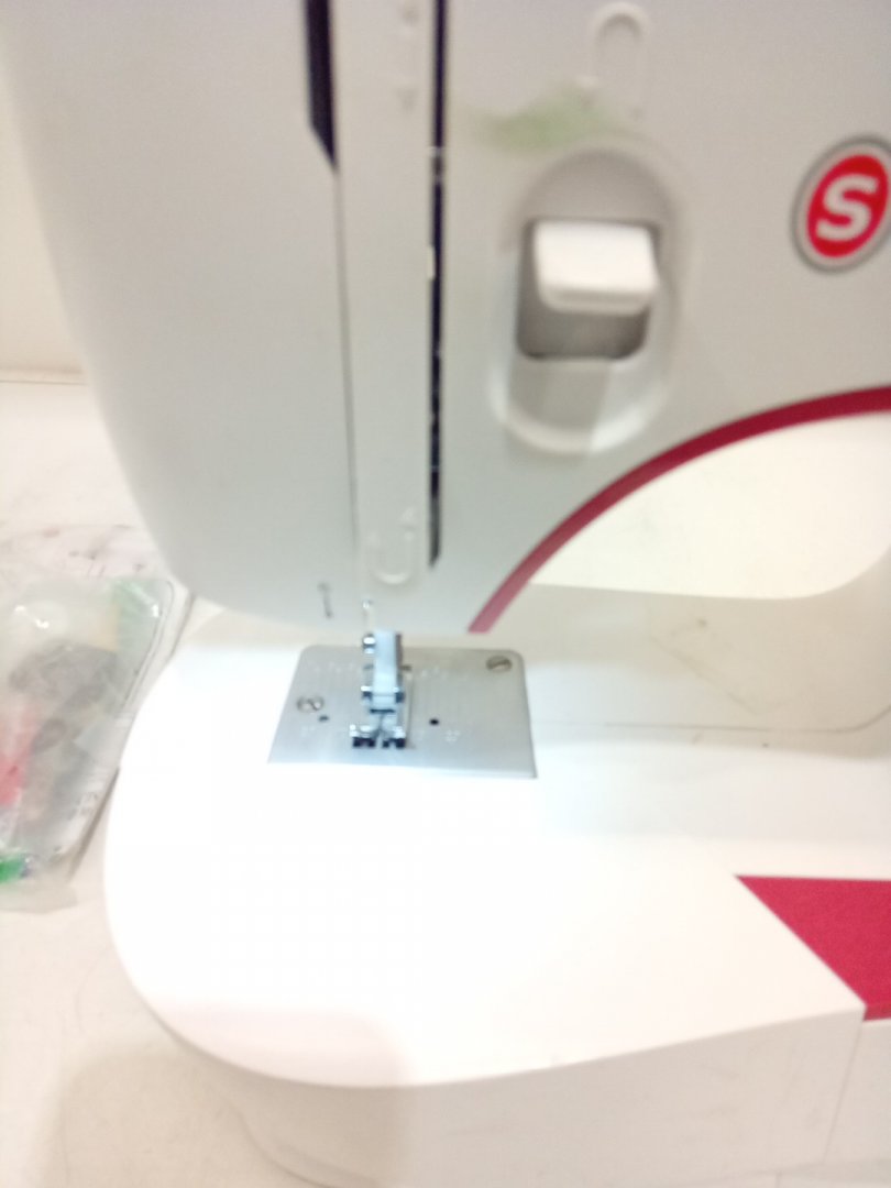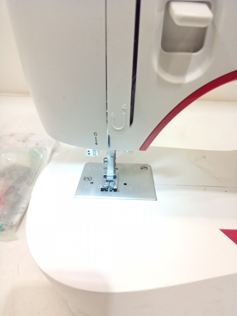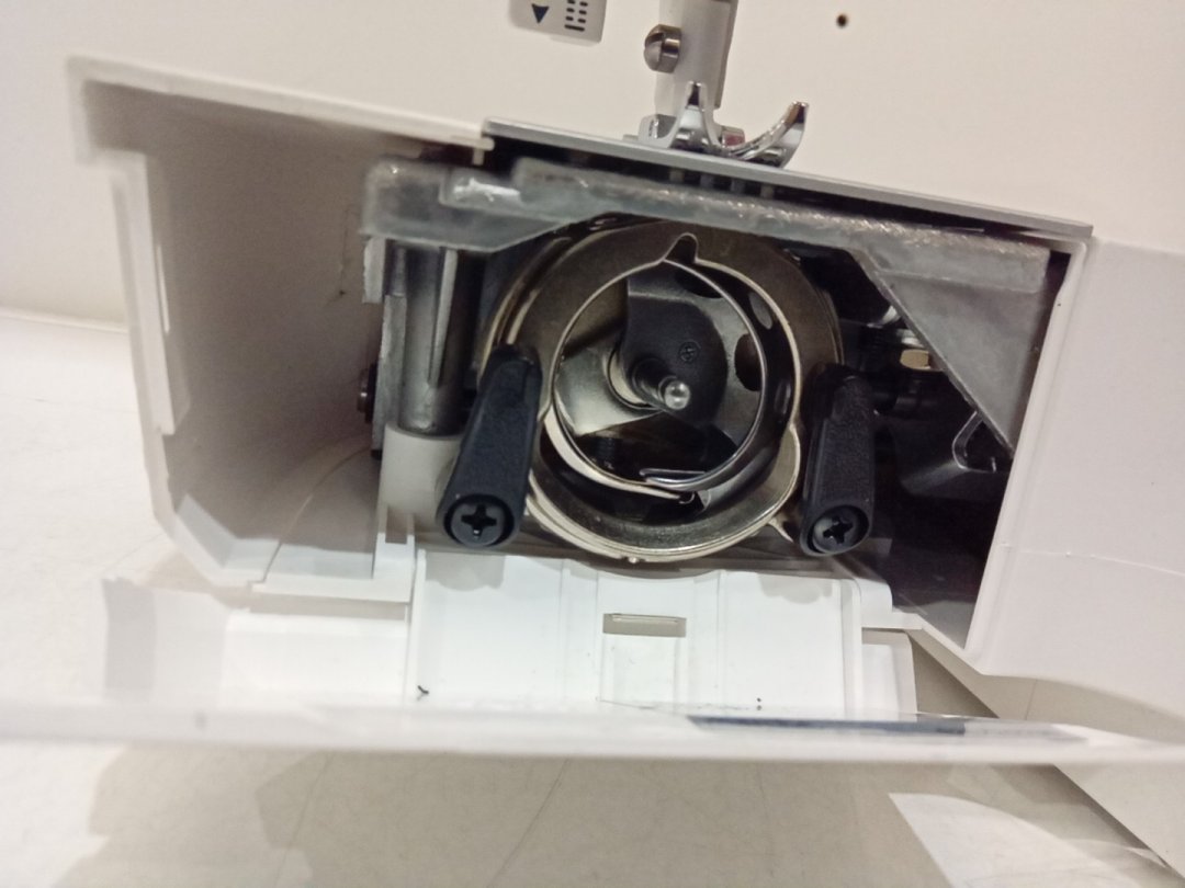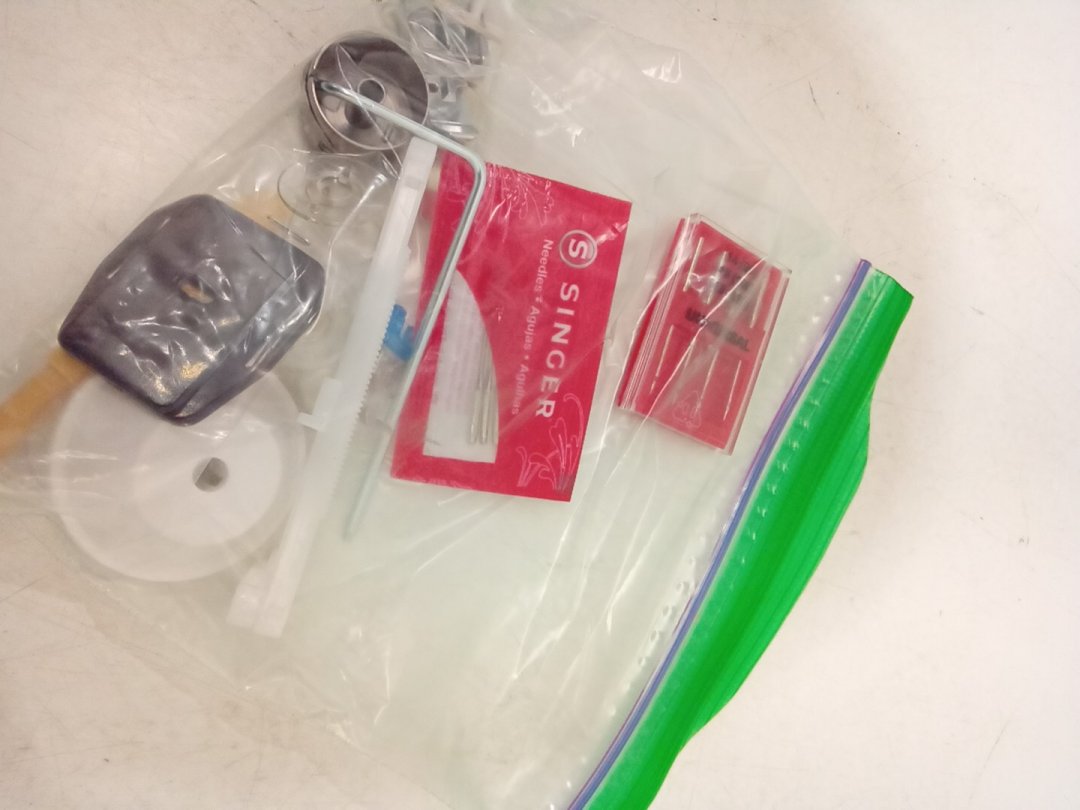 Various scuffs suggest prior use. The seam on the side where the knobs are is loose, but only affects the outer casing. The set is missing the original/default needle, but comes with others. Set may be missing additional accessories, but comes with basics including bobbins.