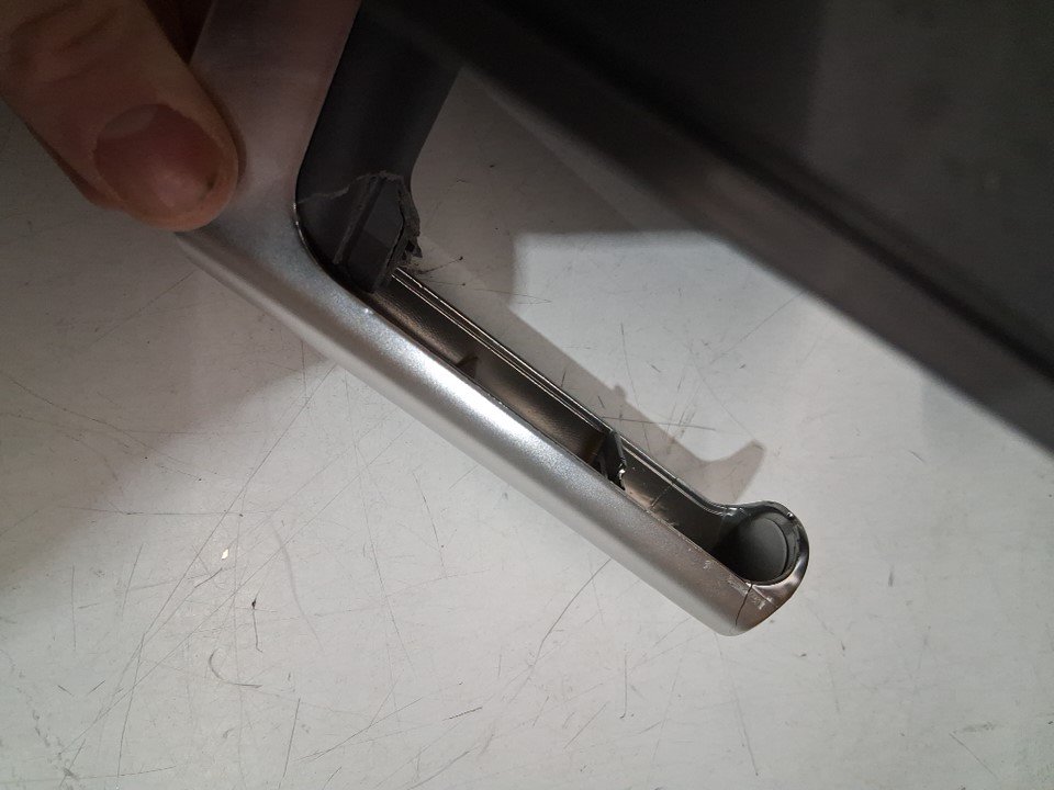 handle plastic broken, smell/scuffs inside machine