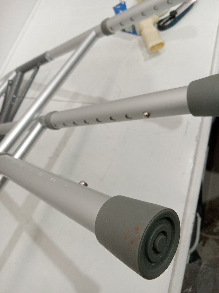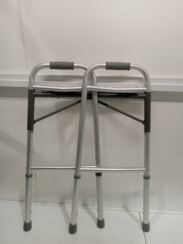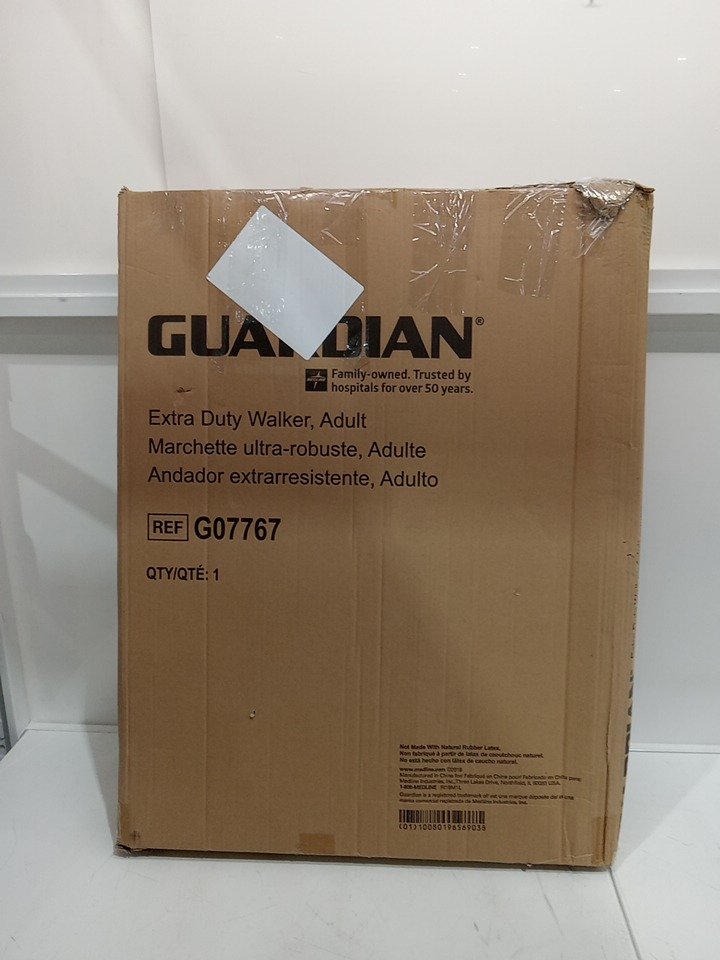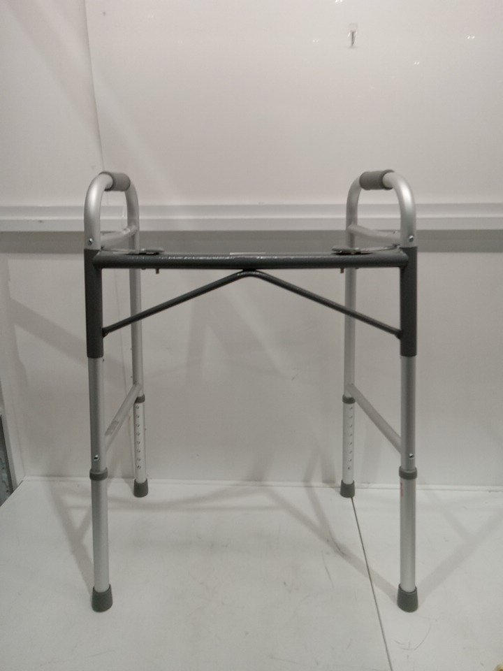 ADULT MEDLINE GUARDINE HEAVY-DUTY TWO-BUTTON FOLDING WALKER, 400LB MAX, ALUMINUM/ALLOY STEEL, 32.25" - 39.25" ADJUSTABLE HEIGHT- SILVER/GREY- (MODEL:G07767)