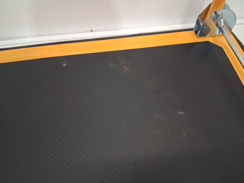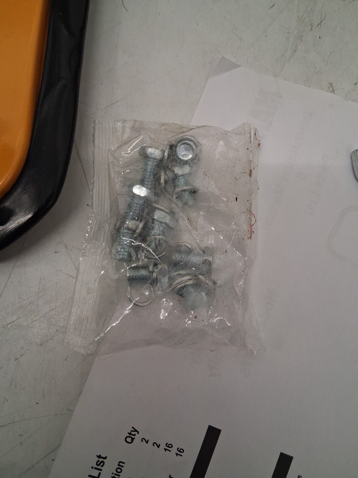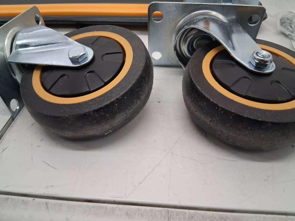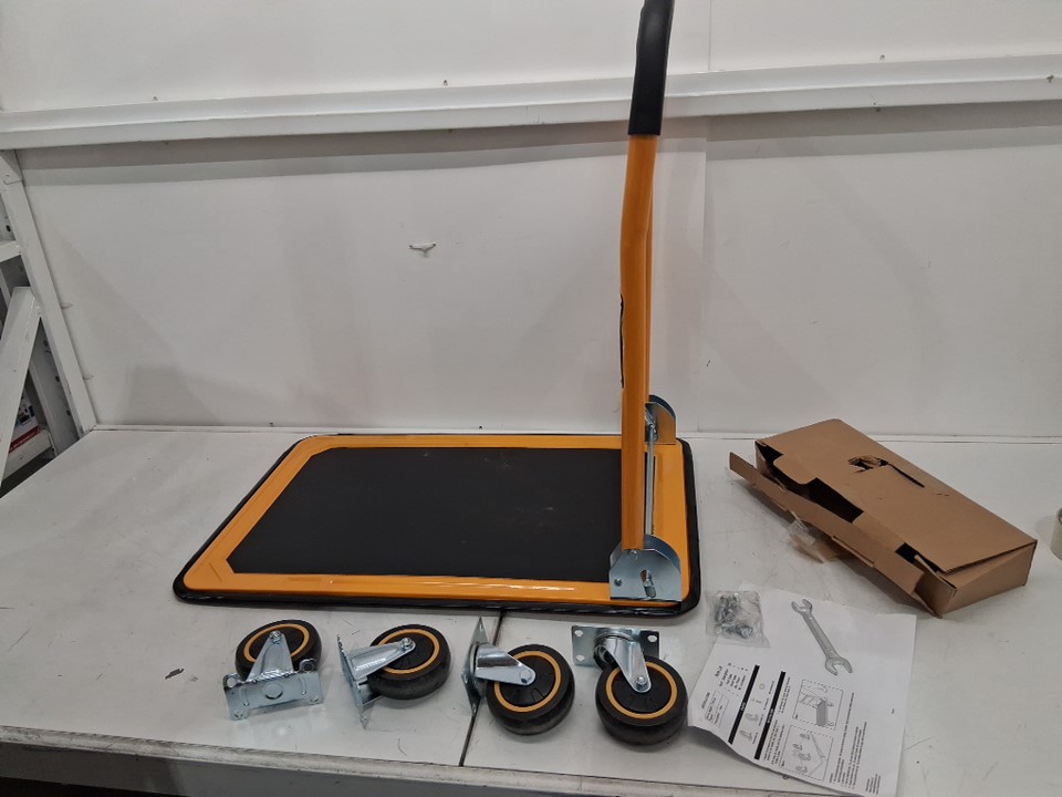 dolly has blemishes from previous assembly, hardware was loose in box, and 7 m8 x 10 bolts are missing. Wheels and dolly have visible dirt on them