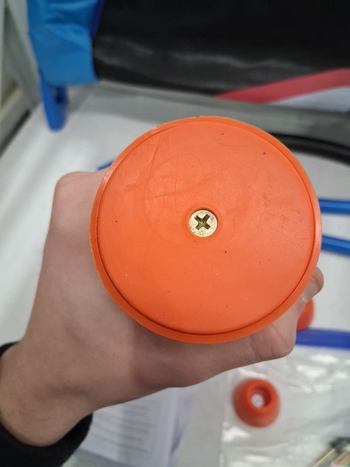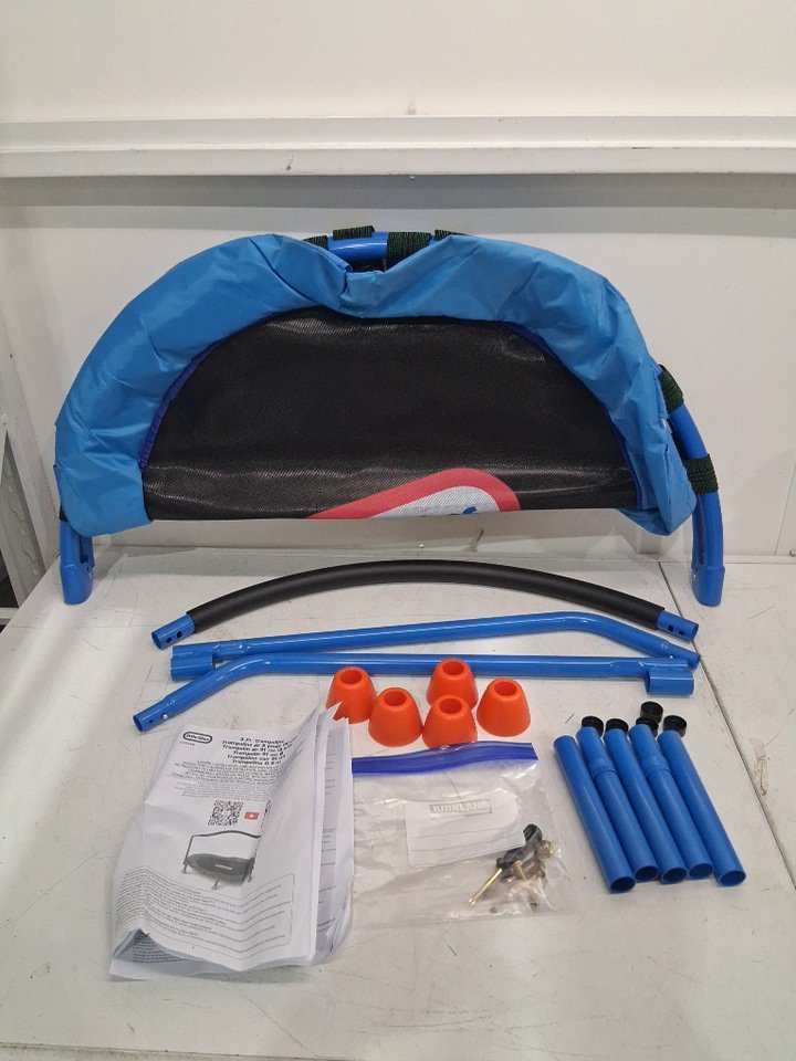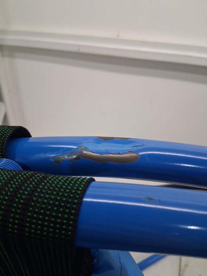 There are indent marks on the orange pieces from being previously jumped on before, and the trampoline poles have some paint chips/ scuff marks on them from previous use. There is also one small dent which won't affect use.