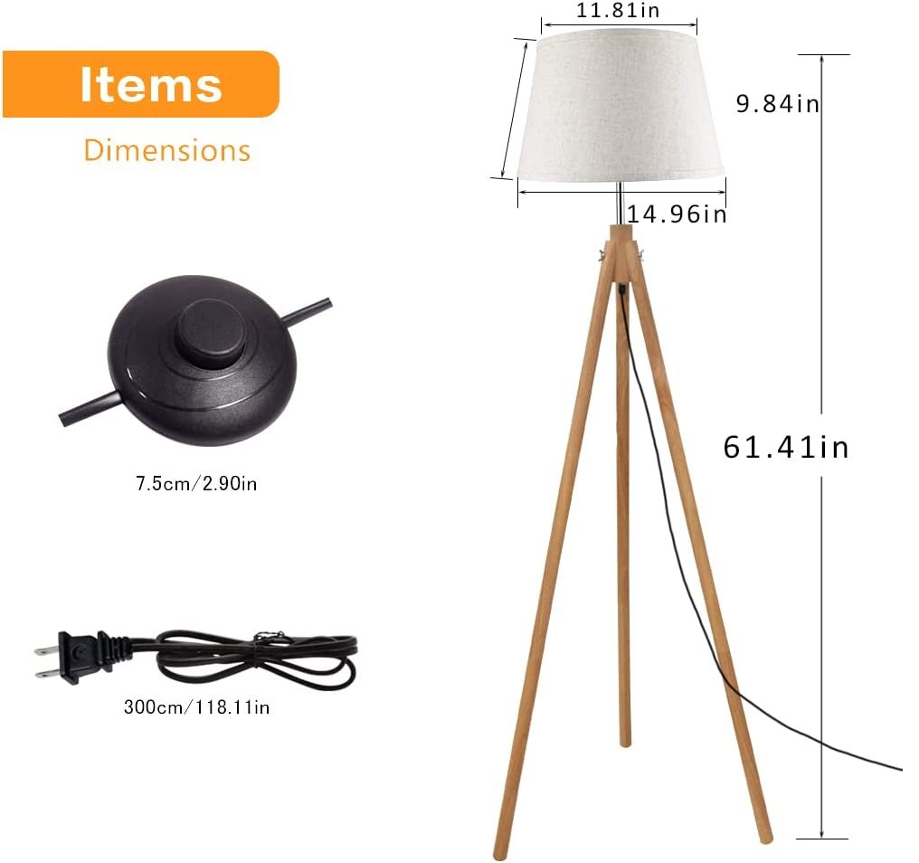 DINGLILIGHTING wooden rustic tripod floor lamp with linen shade- 61.41"- natural brown (MODEL: WSF1094-8B)