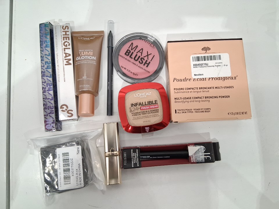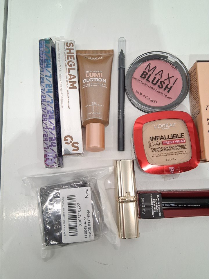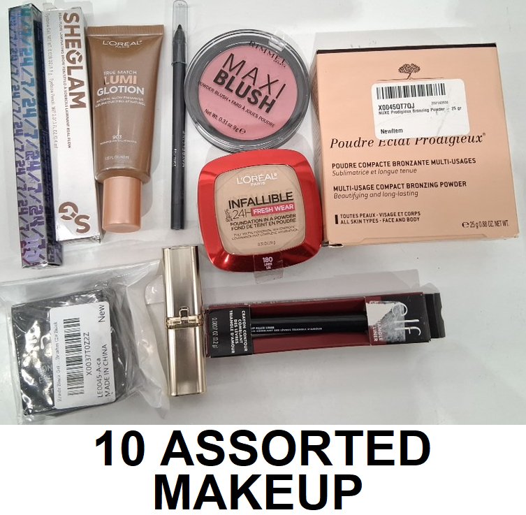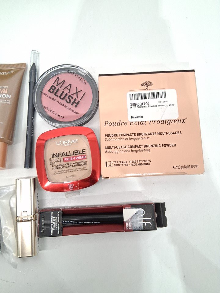 10 assorted makeup products - assorted brands, shades and types - blush / bronzer / lipstick / foundation powder / eyeliner / brow pen