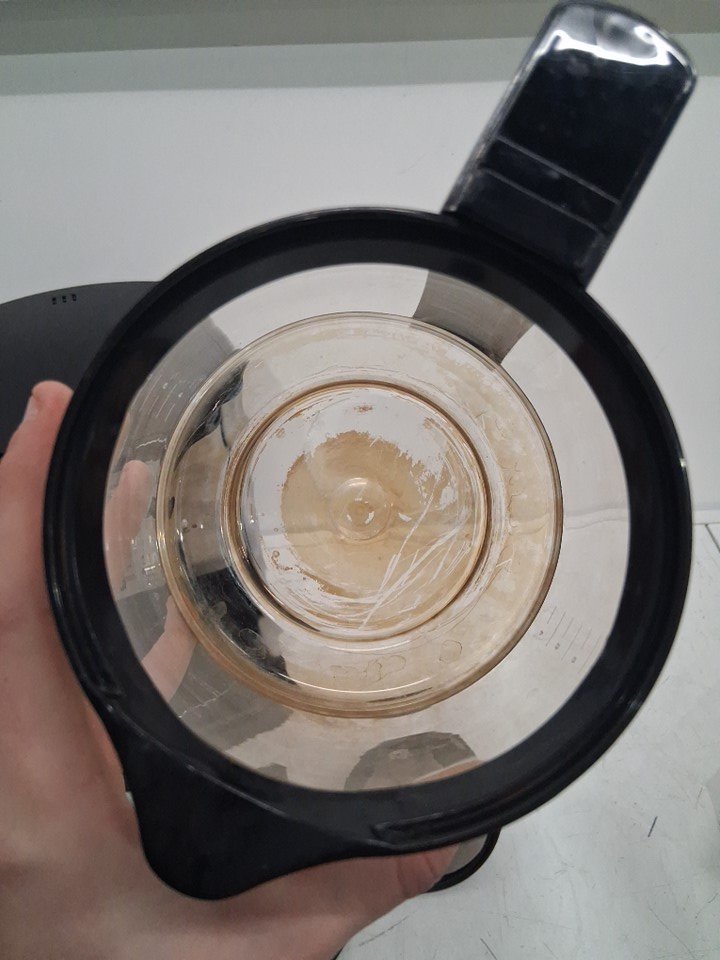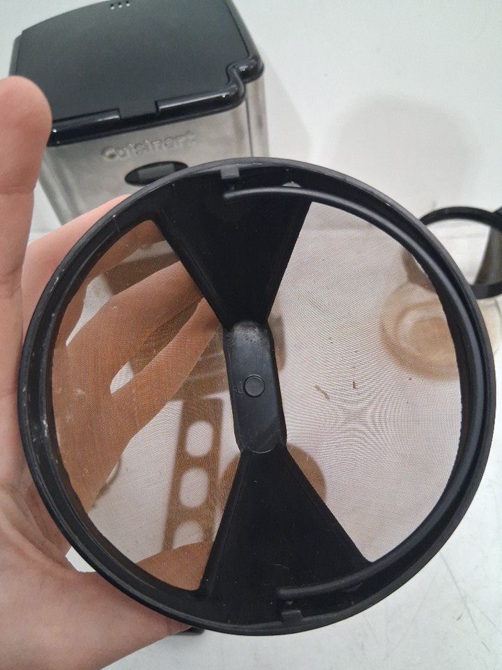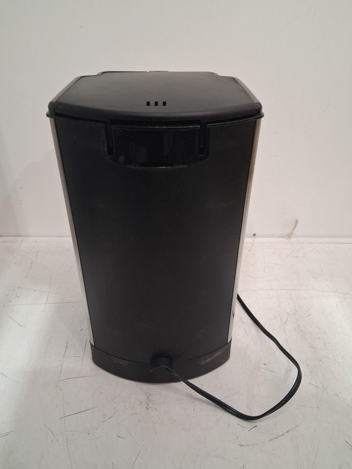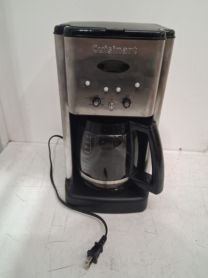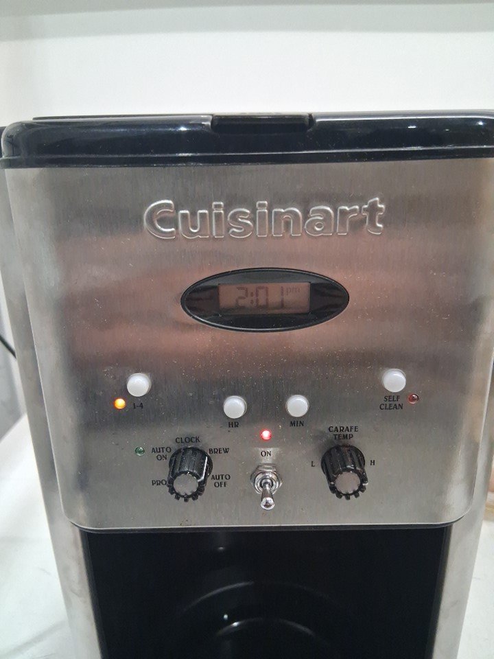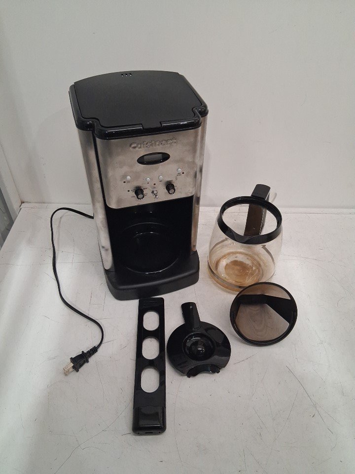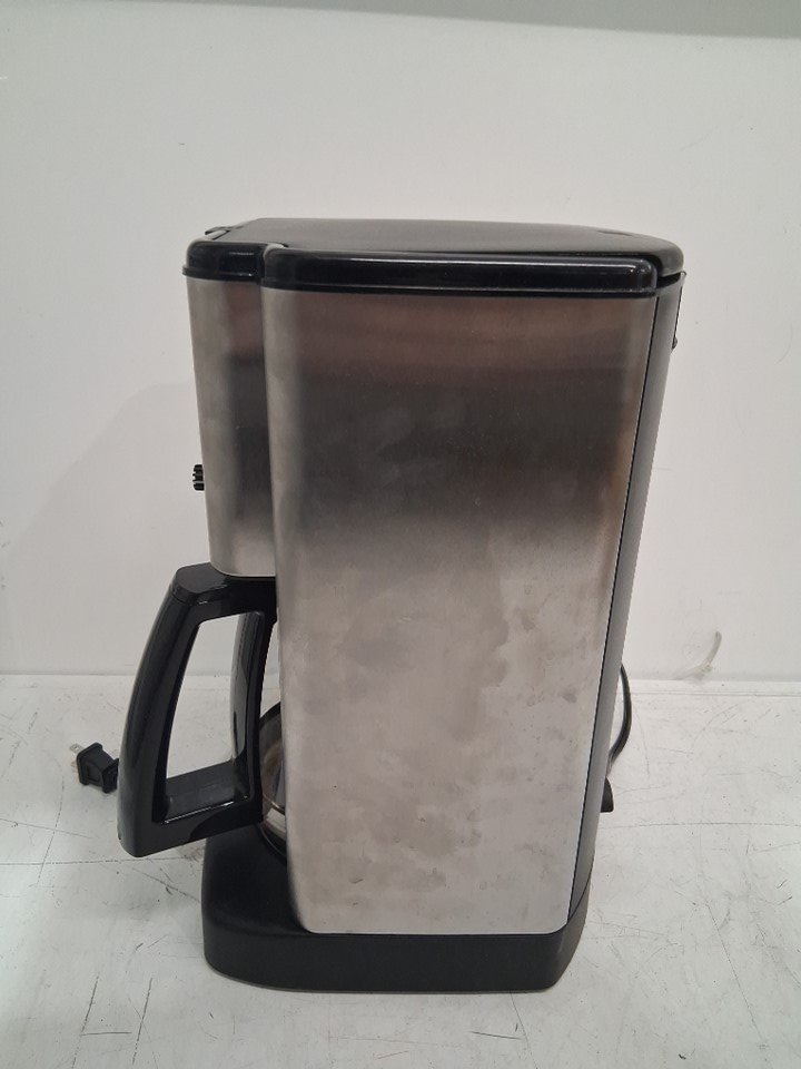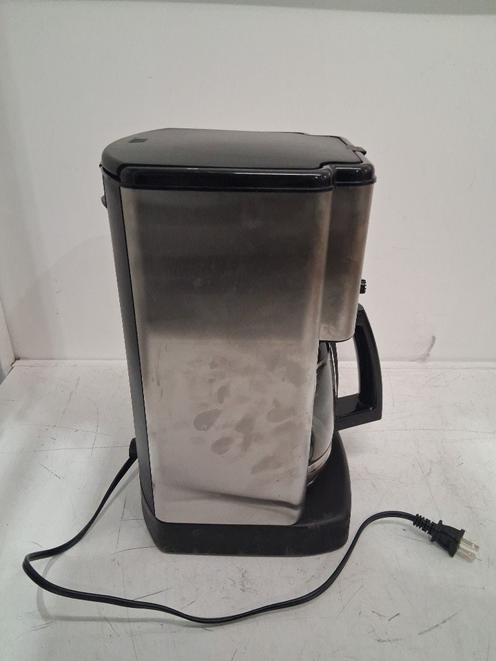 There are coffee stains on the pot from previous use, but the rest is fairly clean. *Please note that it does not look like the self-clean function works on the coffee maker*. Tested for power.