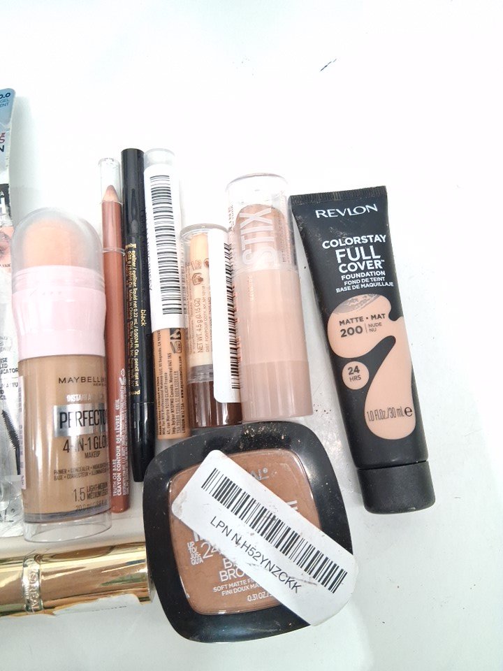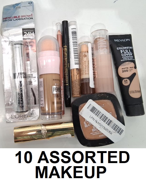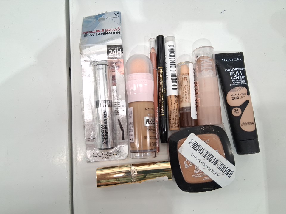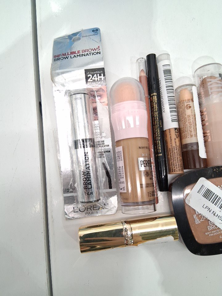 10 assorted makeup products - assorted brands, shades and types - brow laminator / foundation . face powder / concealer / lipstick / lip liner / eyeliner